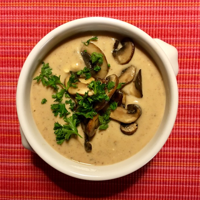Die Suppe mit Salz, Pfeffer und Thymian abschmecken und mit Crème fraiche verfeinern, mit den Champignons und der Petersilie on top servieren. Reicht für 2 Personen als Mahlzeit oder für 4 Personen als (kleine) Vorspeisensuppe. Fertig! Los! Essen!