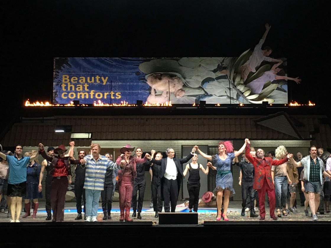 Am beeindruckendsten in dieser Zürcher Produktion ist sicherlich die tolle Ausstattung von Barbara Ehnes (Bühnenbild), Chris Kondek (Video-Design) und dem Duo Joki Tewes/Jana Findeklee (Kostüme) sowie die Spielfreude des Ensembles und der Tänzer, allen voran als Jenny Hill die herrliche ANNETTE DASCH sowie CHRISTOPHER PURVES als Dreieinigkeitsmoses und CHRISTOPHER VENTRIS als Paul Ackermann. Etwas blass und unsicher – auch musikalisch – hingegen KARITA MATTILA (Witwe Begbick). Am Pult der Chef Fabio Luisi persönlich, der für meinen Geschmack die Philharmonia Zürich stellenweise ein wenig zu laut und scheppernd durch die Partitur führt, dabei hat es doch sehr viel schöne lyrische Momente in diesem Stück, die man so leider nicht immer wahrnehmen kann. An diesem Abend erstaunlicherweise auch einige falsche Einsätze bei Sängern und Rhythmus-Probleme – Weill zu singen ist halt nicht ohne… Wenn man den Stil und die Arbeiten von Regisseur Sebastian Baumgarten kennt und mag, hat man hier ein grosses Vergnügen mit herrlicher Musik, tollen Bildern und einem grossartigen Libretto. Verdiente Standing Ovations!