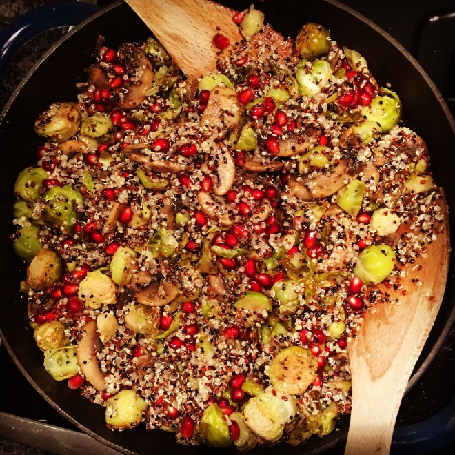 Den Ofen auf 200 Grad vorheizen. Den Rosenkohl putzen und halbieren, in einer feuerfesten Form im Ofen (mit Olivenöl, Salz, Pfeffer und Chiliflocken) ca. 30 Minuten rösten, bis er leicht gebräunt und knackig ist. Mehrmals wenden. Währenddessen die Quinoa zubereiten (ich gebe immer etwas Apfelessig dazu), die Champignons putzen und in Scheiben schneiden und mit etwas Öl, Salz und den getrockneten Kräutern sautieren (ich nehme hier in der Regel Kräuter der Provence und zwar in einer grosszügigen Menge…). Wenn alle Zutaten vorbereitet sind, diese in einer Pfanne oder in einem gusseisernen Dutch Oven vermengen, gegebenenfalls nachwürzen, zum Schluss die Granatapfelkerne dazugeben und kurz alle Aromen etwas durchziehen lassen. Die Mengenangaben kann man ja nach Gusto etwas variieren, ich nehme gerne etwas mehr Champignons und würze diese kräftig mit den Kräutern. Fertig! Los! Essen!