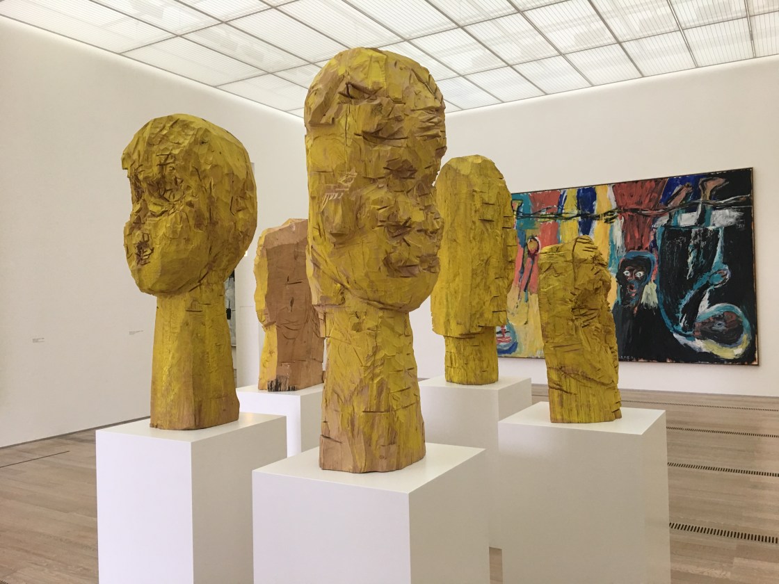 Endlich wieder einmal ein lohnender Besuch in Riehen, in der wunderschönen Fondation Beyeler. Nachdem ich schon länger nicht mehr dort war – die letzten Jahre war das Ausstellungsprogramm fast ausschliesslich auf Menschenmassen programmiert und es war wenig Platz für Neuentdeckungen – hat sich der Besuch zur Baselitz-Retrospektive absolut gelohnt…Aus Anlass des 80. Geburtstages von Georg Baselitz widmet die Fondation Beyeler ihm diese – von Martin Schwander kuratierte – Ausstellung. Und es werden alle Schaffensperioden gezeigt. Von den frühen Werken aus den Sechzigern (die „pan-dämonischen“ Füsse), über die wunderbaren „Orangenesser“-Gemälde aus den Achtziger Jahren bis hin zu den neuen Skulpturen und den Remixen des neuen Jahrtausends, ist eine tolle Werkschau von Baselitz zu sehen und zu erkunden. Mein absoluter Favorit dieser Ausstellung ist der grosse Saal 7 mit der gelben Holzskulpturengruppe der „Dresdner Frauen“ (1989/1990) sowie die beiden Grossskulpturen „Frau Ultramarin“ (2004) und „Meine neue Mütze“ (2003) im Saal 9.