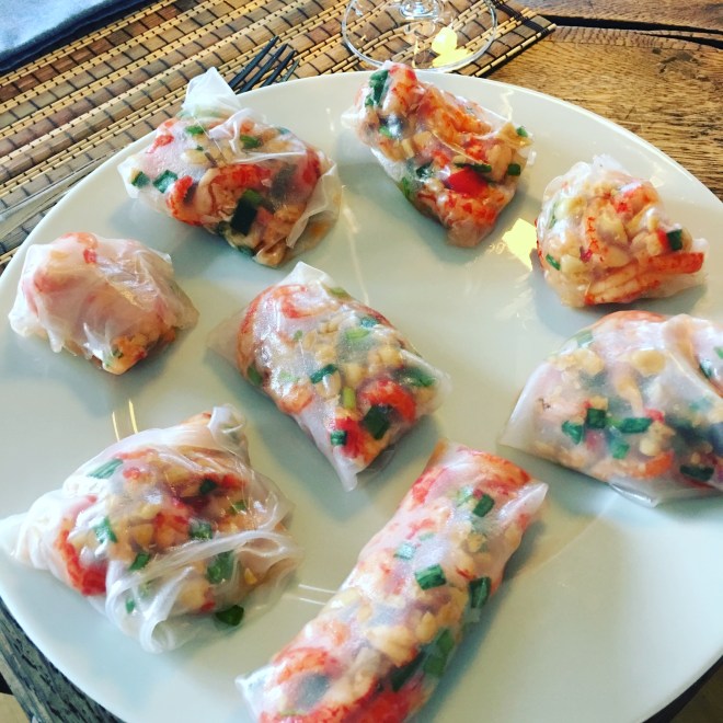 Zunächst alle Zutaten vorbereiten: Die Frühlingszwiebeln (hier empfehlen sich ganz dünne aus dem Asialaden) in feine Ringe schneiden und zusammen mit den Krebsschwänzen, sowie ca. 4 EL Erdnussöl, dem ausgepressten Saft von 2 Limetten, der Fischsauce und dem Zucker abschmecken bzw. marinieren. Die Erdnüsse hacken und dazugeben. Nun wird es etwas tricky: Die Reisblätter (je grösser, je einfacher…) in lauwarmes Wasser tauchen und kurz warten, bis sie biegsam sind – Achtung: das geht relativ zügig. Dann auf ein feuchtes Küchentuch legen, mittig mit einem scharfen Messer halbieren und jede Hälfte mit 1.5 EL der Füllung belegen, die schmalen Enden einklappen, danach die runde Längsseite und am Schluss zum Verschliessen die Schnittkantenseite einklappen und etwas festdrücken. Das Reispapier klebt ziemlich gut und der erste Versuch kann durchaus scheitern. Nur Mut und Dranbleiben! Mein erstes Try-out (wie man unschwer auf dem Foto dieses posts erkennen kann) sieht auch nicht perfekt aus – hat aber sehr lecker geschmeckt und mich animiert, dies zukünftig häufiger auf den Speiseplan zu nehmen. Ideal für Gäste, die Vorbereitung ist minimal und braucht wenig Zeit und es ist eine erfrischende Vorspeise. Dazu reicht man verschiedene Saucen, ich habe es minimalistisch gehalten und Sojasauce (light) sowie Sriracha und gesalzene geröstete Erdnüsse dazu gestellt. Fertig! Los! Essen!