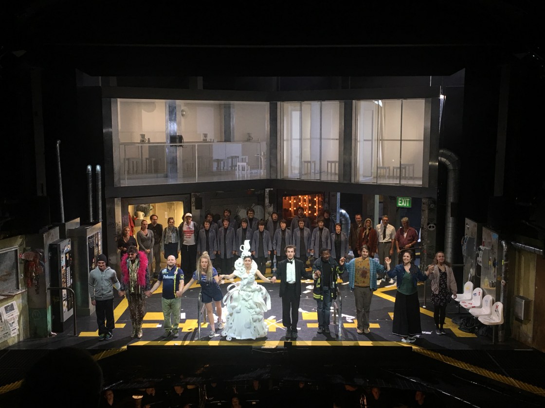 Im nicht besonders gut besuchten Luzerner Theater kam der Slapstick dann aber doch etwas zu kurz, dafür gab es opulente Klänge aus dem Graben und eine bunte vielfältige und irgendwie unentschlossene Musikmelange, fast so, als hätte sich der Komponist nicht entscheiden können oder wollen, was es denn werden soll. Das macht nichts, denn die Musik ist schön, gefällig und untermalt das Geschehen auf der Bühne. Und dort passiert sehr viel. Im Bühnenbild von MÁRTON ÁGH sind zwei Ebenen zu sehen, im unteren Bereich das vielseitige, teils dreckige Leben einer U-Bahn-Station mit Geschäften, Kiosken und dem todbringenden Gleis, im Obergeschoss das sterile und ganz in weiss gehaltene Amt für Todesangelegenheiten (samt seinem Chef – also Gott persönlich – als schräges Disco-Sternchen im Glitter-Glamour-Pailletten-Outfit und Cowboystiefeln, der auch mal launige unverständliche Durchsagen über Lautsprecher von sich gibt, köstlich!!!) – hier werden die Strippen gezogen und festgelegt, wer als nächster Kandidat das Zeitliche segnet. Es dauert ein wenig, bis die Handlung ihren Lauf nimmt, denn zunächst werden sämtliche Protagonisten eingeführt und deren Geschichte in kurzen witzigen Episoden erzählt, bevor sie dann auch schon wieder abtreten und diverser Tode sterben dürfen: Herrlich der verzweifelte Witwer ROBERT MASZL mit seinen inbrünstigen Schluchzern um seine verstorbene Partnerin Elisa, wunderbar als Running-Gag die unglücklich Verlassene – schnulzige Arien singende – GIANNA LUNARDI oder der erfolglose Feuerwehrmann-Darsteller VUYANI MLINDE an seinem Filmset, dazwischen eine wohlstandshintergründige Weltretterin (SOFIA ELENA BORSANI) die jeden Passanten anquatscht und fragt, ob er zwei Minuten Zeit hätte, um die Welt zu retten und letztendlich darstellerisch und sängerisch überragend DIANA SCHNÜRPEL als singende Toilettendame. Doch dann passiert ein Missgeschick im System und die vier Leichen werden wieder ins Leben zurückgeholt und der 2. Teil beginnt nach der Pause mit einem Rewind im Schnelldurchlauf. Das macht Spass zu sehen und ist toll einstudiert. Dann bricht das Ganze, eine Zäsur bringt der Schauspieler LUKAS DARNSTÄDT, der zunächst als Clochard ausführendes Organ des Amtes ist, nun aber als Erzähler die Handlung versucht voranzubringen – ein witziger und überzeugender Monolog im dunklen – nur von den Taschenlampen der Zuschauer-Smartphones beleuchteten – Parkett. Alles wiederholt sich mit vertauschten Rollen und dann ist irgendwie plötzlich Schluss und der Abend ist vorbei. Kurzweilig war es, aber offene Fragen bleiben. Das ist wohl auch so gewollt. Und eigentlich ist es auch egal, denn der Abend ist äusserst unterhaltsam und vom ungarischen Regisseur VIKTOR BODÓ kurzweilig – wenn auch stellenweise etwas oberflächlich – inszeniert.