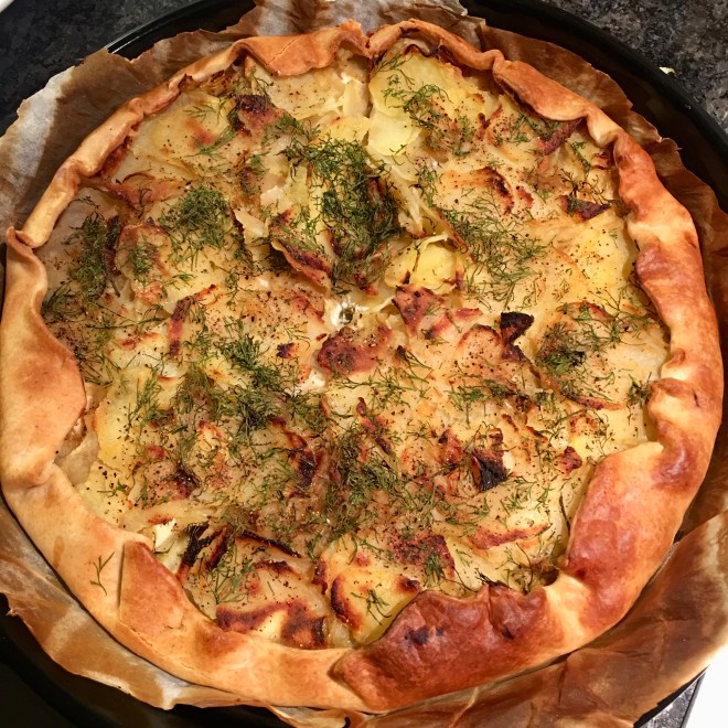 Die Kartoffeln (idealerweise am Vortag) kochen und schälen. Den Fenchel und die Zwiebel fein hobeln und im erhitzten Olivenöl in einer beschichteten Pfanne dünsten, würzen und etwas auskühlen lassen. Die Kartoffeln ebenfalls fein hobeln. Den Teig – wie üblich – in eine Tarte-Form geben, etwas mit der Gabel einstechen und den Sauerrahm grosszügig darauf verteilen, dann mit der Fenchel-Zwiebel-Mischung und den Kartoffeln belegen, den Dill klein zupfen und darauf verteilen, nochmals mit Salz und Pfeffer würzen und Honig darüber träufeln (ich war hier nicht sparsam, diese leicht karamellisierte Süsse gibt dieser Tarte den „Pfiff“…). Den Ofen auf 200 Grad vorheizen und im unteren Drittel ca. 40 Minuten backen, gegen Ende etwas mit Alufolie abdecken, damit die Kartoffeln und der Dill nicht allzu dunkel werden. Fertig! Los! Essen!