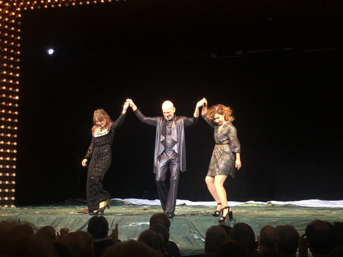 Die drei Schauspieler*Innen MARIE ROSA TIETJEN, KATHRIN ANGERER und MARTIN WUTTKE wundern und fragen sich zu Beginn des Stückes, ob es das nun war – sie kommen direkt aus einer Vorstellung des Shakespearschen „Sommernachtstraum“, die sich von anfangs gefühlten 6 Stunden Vorstellungsdauer bis zum Schluss auf gefühlte 48 Stunden steigert. Dabei stellen sie fest, sie können gar nicht mehr über das Leben nachdenken, da sie eh bereits alles vergessen haben und wie Kathrin Angerer gleich mehrfach betont: „Alles Leben ist ein Prozess des Niedergangs“. 100 Minuten wird in der Affenhand geturnt und geredet und versucht eine angenehme Schlafposition zu finden, werden die Kostüme, Perücken und Bärte gewechselt und philosophiert. Offensichtlich ist es gerade sehr beliebt, Stücke mit einem Revuetheater-Glühbirnen-Portal auszustatten, nach „Sweeny Todd“ (Oper Zürich) und „Nussknacker und Mausekönig“ (Ballett Zürich) nun also auch bei Herrn Pollesch ein herrlich kitschig-leuchtendes Portal der Bühnenbildnerin BARBARA STEINER, zusammen mit dem toll-funkigen Arrangement von Richard Strauss‘ „Also sprach Zarathustra“ und weiteren Perlen der Showmusik ein passender Rahmen für die grossen Auftritte King Kongs, übermächtig und omnipräsent.