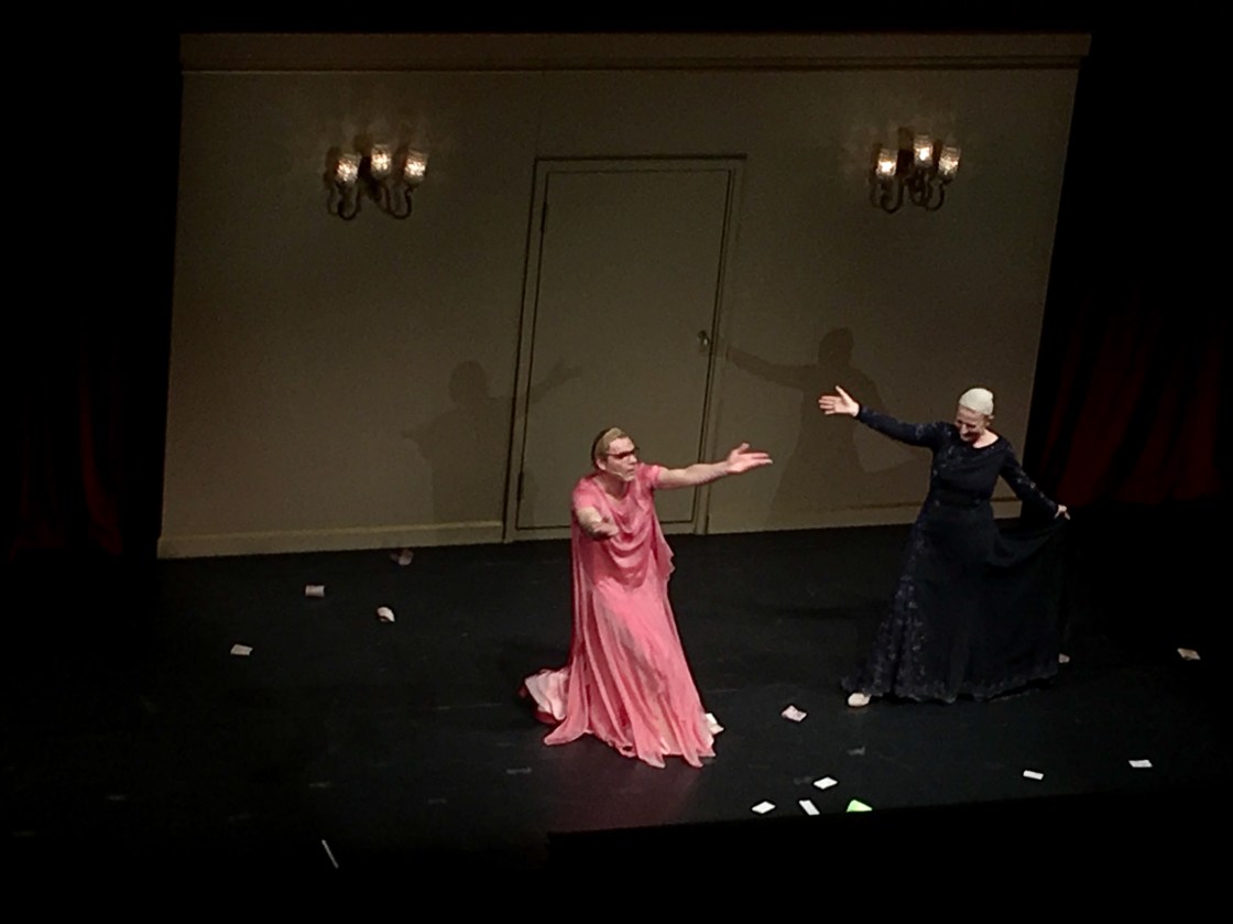 Natürlich gibt es alleine für die 30 unterschiedlichen Rollenwechsel und schnellen Umzüge der Beiden schon grossen Schluss-Applaus, den haben sie sich auch verdient. Koskys einzige Ausstattung auf der Vorbühne ist eine Schwingtür, wie sie häufig für schnelle und temporeiche Klipp-Klapp-Komödien verwendet wird und so konzentriert sich alles auf die Ausgestaltung der beiden Protagonisten, die dieses Stück mit einer köstlichen Vielzahl an Charakterstudien beleben und zu dem temporeichen Operettenkleinod machen, welches es ist – alleine Max Hopp spielt sämtliche Liebhaber der Operetten-Diva Manon Cavallini bei einem gemeinsamen (!!) Dinner. Quintessenz des Abends: „Warum soll eine Frau kein Verhältnis haben?“. Im Mittelpunkt der Geschichte steht eine emanzipierte Frau, die weiss, was sie will und sich das auch nimmt. Kein Wunder also, dass die Nationalsozialisten damit Probleme hatten und mit ihrer antisemtischen Hetzkampagne nicht nur den Komponisten Oscar Straus, sondern auch die damals grosse und gefeierte Diva der Berliner Operette Fritzi Massary ins Exil trieben. Die Zeit bei dieser flotten Inszenierung vergeht wie im Fluge und so ist nach 90 Minuten die komplette Geschichte erzählt, die wunderbar beschwingte Musik bleibt noch lange im Ohr. Manzel und Hopp wechseln die Geschlechter, das Alter, die Dialekte und spielen teilweise in halb/halb-Kostümen Mann und Frau zeitgleich – das ist unterhaltsam und amüsant, aber dann ist es auch irgendwann genug mit der Berliner Gassenschnauze. Aus dem Graben swingt es herrlich mit den mitgereisten Musikern der Komischen Oper unter Adam Benzwi, das ist Unterhaltung, das ist Entertainment, aber keine Spur von Oberflächlichkeit – Barrie Kosky, selbst mit jüdischen Wurzeln, versteht es, am Kitsch vorbei zu erzählen. So soll es sein! Und so klingt es auch! Ein vergnüglicher 2-Personen-Kraftakt als Kammerspiel, das sehr gut auch ohne Chor, Balletteinlagen und grosse Ensembles auskommt und gleichzeitig den Biss der Berliner Operetten der 20er Jahre hat. Kein Wunder hat diese Produktion in Berlin mittlerweile Kultstatus…