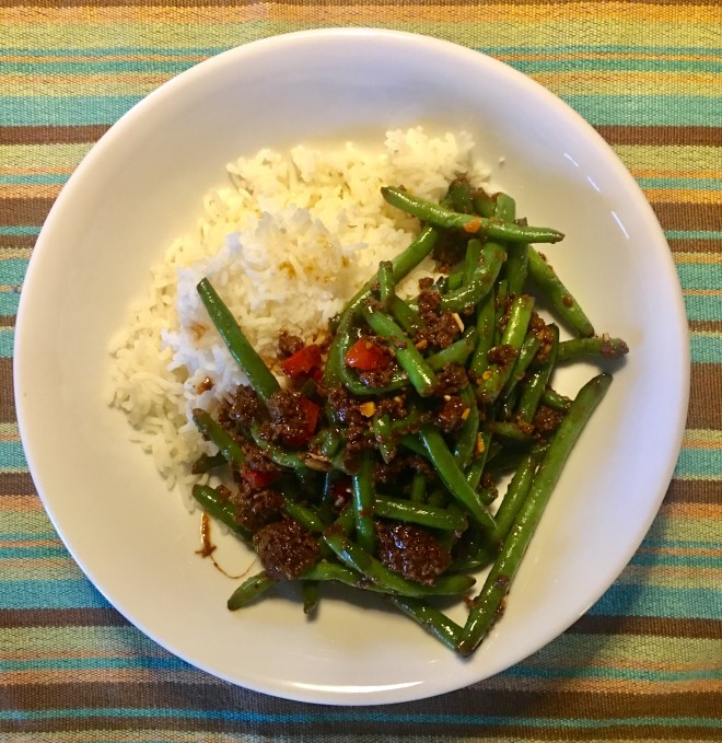 Aus 1 EL Shaoxing-Wein, 1 EL heller Sojasauce, 1 TL dunkler Sojasauce, 2 EL Wasser, 2 EL frisch geriebenem Ingwer, 0.5 TEL braunem Zucker und 1 TL Maisstärke eine Marinade herstellen, mit dem Hackfleisch gut vermischen, bis alles vom Hack absorbiert ist und eine gute halbe Stunde im Kühlschrank marinieren lassen. Im Wok die vorbereiteten Bohnen in heissem Öl anbraten, dabei mehrfach umrühren, bis sie durch, aber noch knackig, sind. Das dauert insgesamt ca. 5-8 Minuten, danach die Bohnen aus dem Wok nehmen und beiseite stellen. Nun erneut Öl im Wok erhitzen und das marinierte Hackfleisch gut anbräunen, nicht allzu sehr wenden, damit es etwas knusprig werden kann. Die Hitze auf medium reduzieren und den fein gehackten Knoblauch, die Paprika und die Chilis dazugeben, ca. 1 Minuten mitbraten, dann die grünen Bohnen, 0.5 TL braunen Zucker, 1 TL Sesamöl (geröstet), 1 TL helle Sojasauce, 2 EL Wasser sowie 0.25 TL frische gemahlenen weissen Pfeffer und eine Prise Salz dazugeben, alles gut durchmischen, abschmecken und auf Reis servieren. Fertig! Los! Essen!