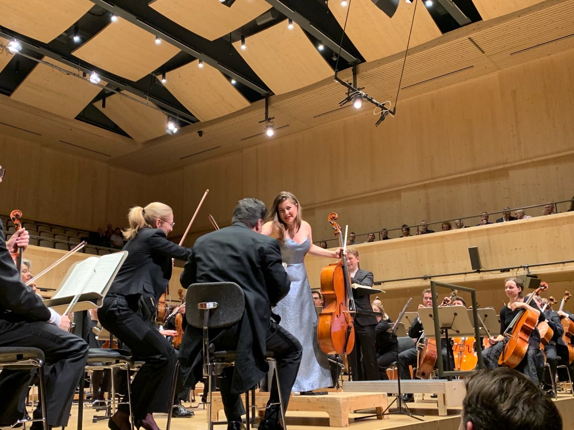 Benjamin Brittens Sinfonie op. 68 für Cello und Orchester wurde 1964 vom Widmungsträger Mstislav Rostropowitsch zusammen mit dem Moskauer Philharmonischen Orchester uraufgeführt – am Pult stand Britten selbst. Es ist ein eher düsteres Werk, nur ab zu gibt es fein-melodiöse Lichtblicke, insgesamt sehr gefühlsbetont und emotional. Und so erlebt man auch die Solistin ALISA WEILERSTEIN mit ihrem Spiel am Violoncello: eine Mischung aus Hingabe und Vergeistigung. Sehr versunken in die Musik, wo nötig eine harmonische Einheit mit dem Orchester, dennoch wach und präsent in ihren Solopassagen. Ein interessantes Stück, nicht gerade gängig, aber eine ideale Vorbereitung für den Zeitgenossen Schostakowitsch nach der Pause. Obwohl ich Britten sehr mag und gerne höre, hat mich dieses Werk nicht gepackt.