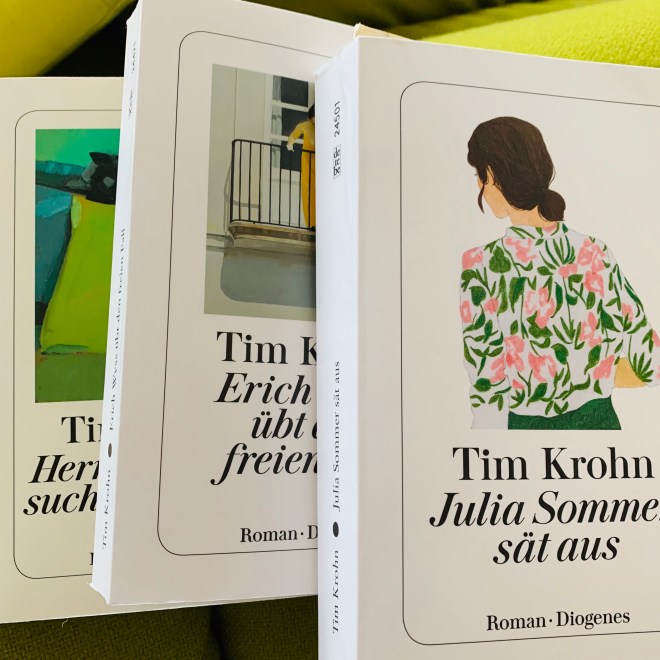 Die Romanserie „Menschliche Regungen“ entstand 2015 als Crowdfunding-Projekt und so konnte man aus einer langen und immer wieder erweiterten Liste menschlicher Regungen (von Aalglätte bis Zynismus) auswählen und zusätzlich bis zu drei Wörter oder Zahlen angeben, die Krohn mit der Geschichte verwebt hat. Somit wurde man zum Unterstützer dieses Projektes. Mittlerweile sind bereits 3 Romane erschienen (zunächst im Berliner Galiani-Verlag, mittlerweile als Taschenbuch-Ausgabe bei Diogenes): „Herr Brechbühl sucht eine Katze“, „Erich Wyss übt den freien Fall“ und „Julia Sommer sät aus“. Dabei wird kein Thema ausgeklammert, Bewohner kommen und gehen, sterben, leben, lieben, hassen – allerdings im glaubwürdigen Rahmen und nicht als geballte Handlungsladung, wie man das häufig von Soaps wie „Lindenstrasse“ oder „Gute Zeiten, schlechte Zeiten“ gewohnt ist. Sämtliche Personen sind absolut authentisch, glaubwürdig, man schliesst jede*n einzelne*n davon ins Herz. Und kann es nicht erwarten, bis der nächste Band erscheint und man in neuen Episoden menschlicher Regungen am Leben der Bewohner teilnehmen kann. Leider ist jedoch auf der Projekt-Homepage aktuell zu lesen, dass sowohl Galiani, als auch Diogenes nicht daran interessiert sind, den bereits geschriebenen vierten Band zu veröffentlichen – such a shame!