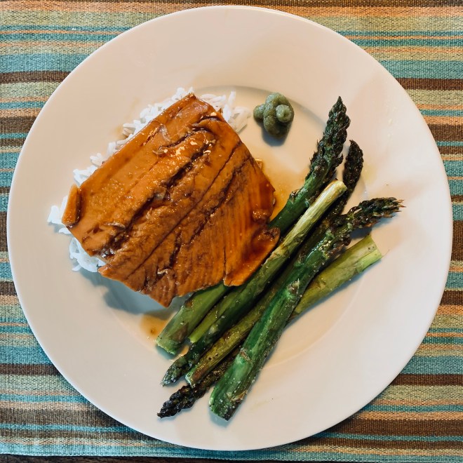 Zwar kann man fertige Teriyaki-Saucen in jedem Asiamarkt kaufen, aber es lohnt sich diese selbst zuzubereiten, das geht schnell und kann individuell für jeden Geschmack variiert werden. Ich persönlich mag es immer gerne mit etwas mehr Süße: Die Sojasauce, Mirin und Zucker vermischen, die beiden Lachstranchen (gewaschen und mit einem Küchentuch trockengetupft) darin für ca. 5-10 Minuten marinieren. Darauf achten, dass der Fisch komplett bedeckt ist, sonst nach der Hälfte der Zeit wenden. Die beiden Lachstranchen in wenig Öl in einer beschichteten Pfanne für 2 Minuten anbraten, die zurückbehaltende Marinade angiessen, aufkochen lassen, den Lachs wenden und nochmals für ca. 2 Minuten (abhängig von der Dicke der Tranchen) köcheln lassen. Den Lachs herausnehmen und auf Basmatireis anrichten. Den Reisweinessig in die verbliebene Marinade rühren, kurz aufkochen, dann über den Lachs geben. Mit etwas Wasabi und/oder Limettenspalten servieren. Dazu passt gedämpftes saisonales Gemüse, aktuell natürlich grüner Spargel aus dem Ofen (etwas Öl, schwarzer Pfeffer, grobes Meersalz, Zitronensaft…). Fertig! Los! Essen!