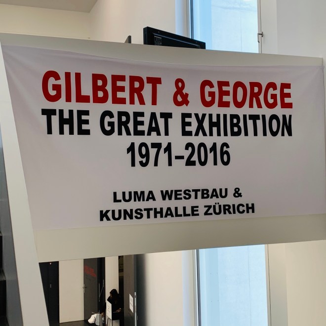 „Gilbert & George“ – THE GREAT EXHIBITION, 1971-2016 in der Kunsthalle Zürich/LUMA Westbau. Zu dieser Ausstellung (die bereits in Arles, Stockholm und Oslo zu sehen war und als nächstes in Island zu sehen sein wird) gibt es einen sehr schönen Ausstellungskatalog mit mehreren Interviews mit Gilbert & George, von denen jedes für ein Jahrzehnt ihres Schaffens steht.