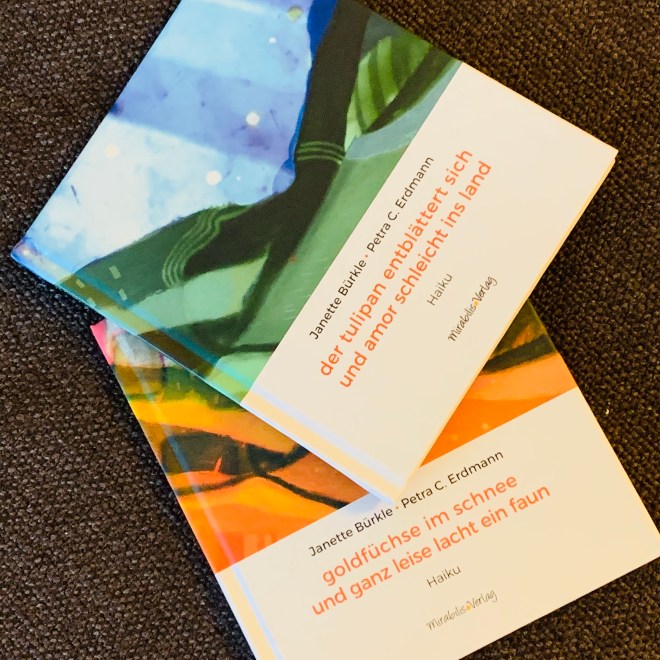 Nach „der tulipan entblättert sich und amor schleicht ins land“ gibt es nun neu „goldfüchse im Schnee und ganz leise lacht ein faun“ von Janette Bürki und Petra C. Erdmann, beide erschienen im Mirabilis Verlag – beide bezaubernd gestaltet und wunderbar, wenn man sie zwischendurch kurz zur Hand nimmt, blättert und sich an den herrlichen Haikus (und Bildern!) erfreut. Das sind die kleinen und bezaubernden Alltagsmomente und Ruhe-Oasen, die man sich selbst bereiten kann.