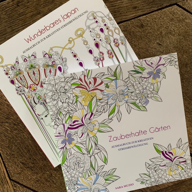 Mittlerweile ist eine Vielzahl an unterschiedlichsten Ausmalbüchern erschienen, von indischen Mantras, über Tier- und Natursujets, bis hin zu Stammtischsprüchen und schlüpfrigen „Erwachsenen“-Motiven (huh, hah….) ist fast alles erhältlich. Die Qualität der Vorlagen ist allerdings sehr unterschiedlich, wenn man etwas sucht, finden sich jedoch Preziosen von hoher Ästhetik. Eine Entdeckung sind die Ausmalbücher von Sara Muzio „Zauberhafte Gärten“ und „Wunderbares Japan“, aussergewöhnliche Vorlagen von Papierlaternen, Origami-Kranichen, Zen-Gärten, Bonsais, überbordenden Blumenarrangements mit wunderschönen Details- Natur in verschwenderischer Form.