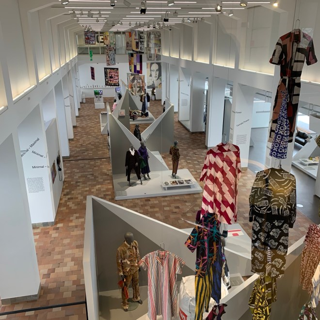 Die Ausstellung ist grosszügig und luftig gestaltet, bietet viele bekannte Namen, aber auch Unbekanntes und einen Dress-Up-Table, an dem sich mehr Erwachsene als Kinder zu schaffen machen, um aus Zeitschriften und Stoffen Modekollektionen für Papierpuppen auszuschneiden. Neben vielen farbenfrohen Exponaten, Schnittmustern, Stoffen, Ensembles, hat man an mehreren Screens die Möglichkeit, mehr zu den jeweiligen Themen zu erfahren. Und wenn man Glück hat, erlebt man noch die ein oder andere Überraschung und findet ein Kleidungsstück, was zu Hause im eigenen Kleiderschrank liegt – wow, mein (wunderschöner) gelber Pyjama von Viktor & Rolf aus dem Hause Calida zählt zur Schweizer High Fashion…