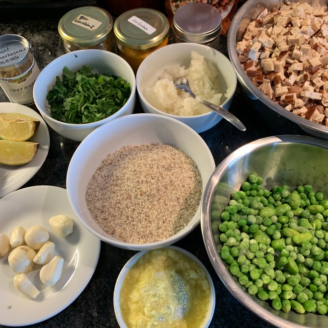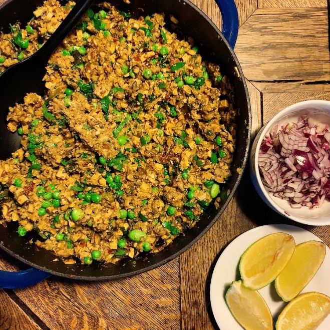600 – 700 Gramm braune Champignons (fein geschnitten), 200 Gramm Räuchertofu (fein geschnitten), 1 weisse Zwiebel (gehackt), 1 Stück frischer Ingwer (ca. 4-5 cm, gerieben), 8 mittelgrosse Knoblauchzehen, 3 grüne Chilischoten (entkernt, in feine Ringe geschnitten), 100 Gramm gemahlene Mandeln, 1 TL Garam Masala, 1.5 TL Kreuzkümmel (gemahlen), 1.5 TL Koriander (gemahlen), 0.5 TL Kurkuma, 0.5 TL Salz, 150 Gramm Erbsen/50 Gramm Edamame (TK, aufgetaut), 20 Gramm frische Minze, 20 Gramm frischer Koriander, Rapsöl – dazu: 4 Brötchenhälften, 1 fein gehackte rote Zwiebel, 1 Limette (in Spalten geschnitten)