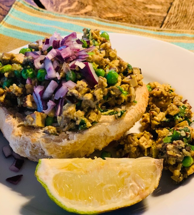 Für die Vorbereitung muss man sich etwas Zeit nehmen, denn diese Pilzmenge und den geräucherten Tofu sehr klein zu schneiden braucht etwas Zeit. Beim Tofu kann man sehr gerne einen gut gewürzten Räuchertofu verwenden, ich habe mich für einen mit Sesamkörnern entschieden. In einer grossen und möglichst beschichteten Pfanne die weisse Zwiebel ca. 10 Minuten auf mittlerer Hitze braten, bis sie karamellisiert, aber nicht zu sehr gebräunt ist – dann Ingwer und die Chilis zufügen, den Knoblauch dazu pressen und für ungefähr 2 Minuten anschwitzen. Die Mandeln für ca. 5 Minuten mitbraten und am Ende die Gewürze und das Salz zufügen, es kann leicht klumpen, das gibt sich wieder, sobald man die Pilze und den Tofu hinzugegeben hat. Das ist zunächst ein grosser Haufen, aber nach ca. 10 – 12 Minuten sind die Pilze zusammengefallen. Dann die Erbsen und Edamame zugeben und nochmals für ein paar Minuten die Mischung erhitzen, vom Herd nehmen, die frisch gehackten Kräuter zugeben und mischen. Die Brötchenhälften entweder mit Öl beträufeln und in der Pfanne rösten oder in den Toaster stecken, bis sie leicht knusprig sind.