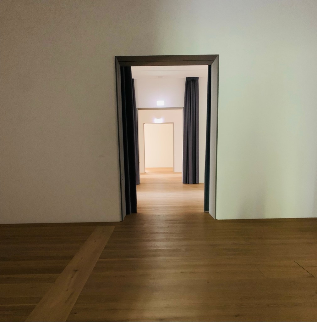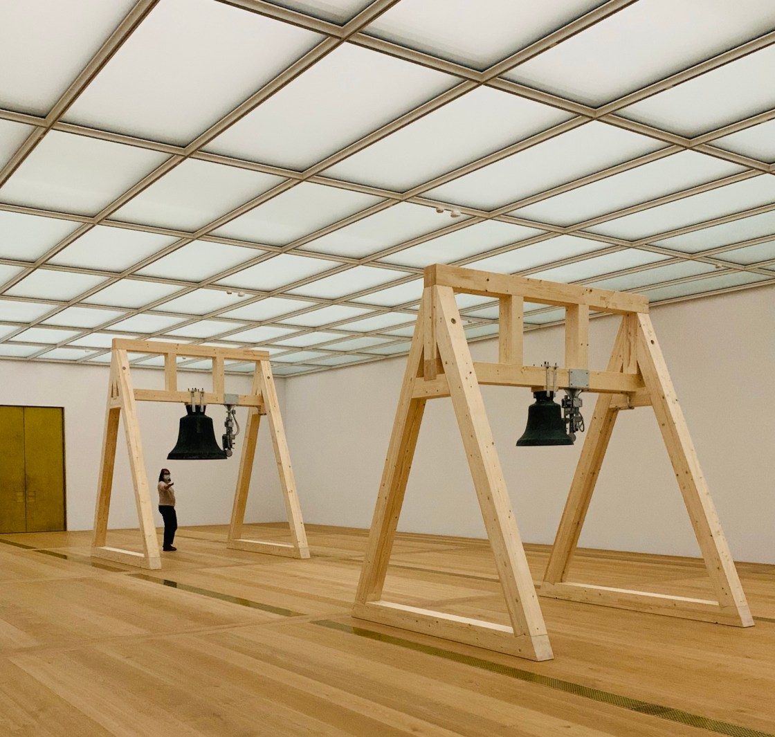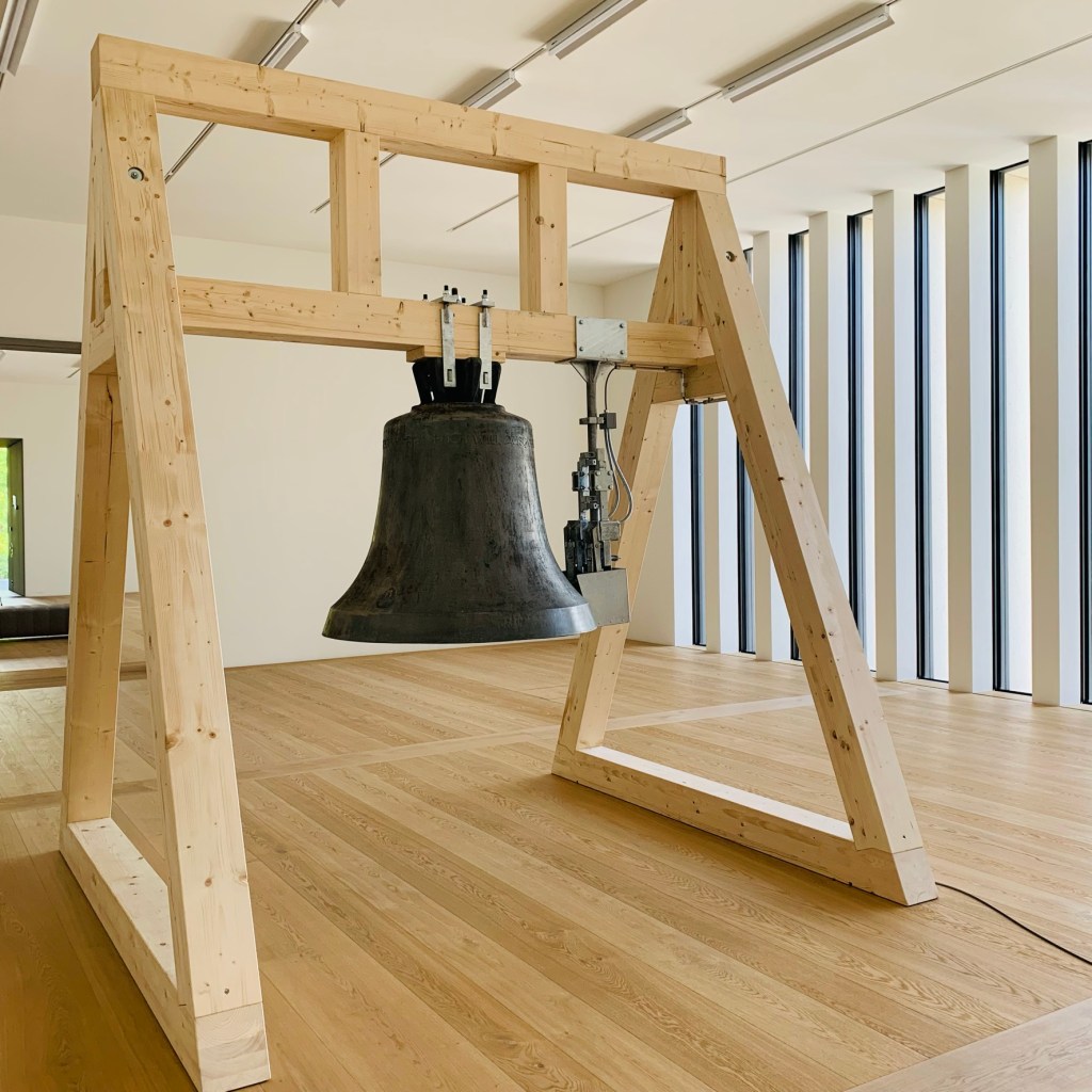 Es ist ein Erlebnis, dieser wunderbare Rundgang durch die leeren Säle, einzig begleitet durch die Glockenklänge – mal nah, mal fern. Man spürt die Schwingungen und die dadurch ausgelöste fast schon feierliche Erhabenheit. Als raumwandelnder Besucher hat man das Gefühl, einem Initiierungs-Ritual beizuwohnen und das ist es wohl auch: Eine Weihe, ein Durchschreiten, ein erstmaliges Erleben. Die eigentliche Idee und der Auftrag lautete ursprünglich, etwas Verbindendes zu schaffen, eine Kreation der Interaktivität – dann kam Corona und mit ihr eine neue Form der individualisierten Wahrnehmung. Entstanden ist: Ein Rundgang durch leere Räume, alleine, jeder für sich, aber verbunden durch die Vibrationen des Glockenklangs. Wie von selbst passt man seine Schritte, sein Tempo, seinen Atem der Installation an, es hat etwas Feierliches. Jeder Besucher findet seine eigenen Bilder und dennoch verbindet diese Installation, sie bewegt alle und jeden – das ist spürbar, erlebbar. Dazu die neuen lichtdurchfluteten Räume, leer und bereit für die Aufnahme der kommenden Sammlungen und Ausstellungen, die bisher nur an der bereits vorhandenen Beschriftung ablesbar sind. Klare Formen. Klare Wege. Klare Konturen.