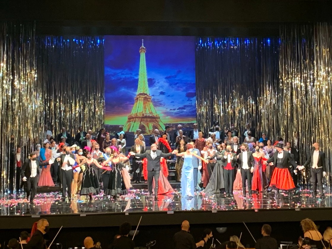 Überraschenderweise gab es noch hervorragende Logenplätze (die man dann auch komplett für sich alleine hat) und beim Kauf am Ticketschalter (als hätte er darauf gewartet) erzählt uns der Regisseur des Abends OSCAR CECCHI von den Schwierigkeiten einer Corona-konformen Inszenierung: In Italien kein Testregime für alle Beteiligten möglich, ein Mindestabstand zwingend. Und so sehen wir es dann auch am Abend, der Chor teilweise mit Mund-Nasenbedeckung, die Solisten mit gebotenem Abstand. Dem Charme dieser Inszenierung tut dies keinen Abbruch, auch wenn Hanna Glawari (VALENTINA MASTRANGELO) und Danilo Danilowitsch (GIANLUCA TERRANOVA) sich während „Lippen schweigen“ und beim grossen Finale mit gebührendem Abstand gegenüberstehen – andere Zeiten, erfordern besondere Massnahmen, neue Bildwelten. Dennoch immer wieder konsequent inkonsequent – die Damen und Herren des Balletts tanzen logischerweise nah beieinander und auch sonst gibt es den ein oder anderen „Abstands-Ausrutscher“. Die üppige Ausstattung (PAOLO VITALE) und eine hervorragende Besetzung bis in die kleinsten Rollen erfreuen uns also am Abend eines heissen Sommertages im Teatro Lirico Giuseppe Verdi im wunderschönen Trieste. Das Stück steht und fällt mit der Spielfreude des Ensembles, hier muss man vor allem den Njegus von ANDREA BINETTI nennen, köstlich, amüsant und auf dem Punkt! Besonders aufmerksam wird man beim wunderbaren Tenor von ORESTE COSIMO als Camille de Rossillon. Die italienischen Dialoge und Gesangsnummern sind gewöhnungsbedürftig, man gewöhnt sich aber schnell daran, eine neue Erfahrung ist es jedenfalls und „La vedova allegra“ klingt frisch und spritzig, die oftmals grässlich übertriebene Walzerseligkeit vermisst man nicht, CHRISTOPHER FRANKLIN dirigiert einen sehr modernen Lehàr. Langanhaltender und begeisterter Applaus zum Ende aus den sehr ausgedünnten Sitzreihen und Logen.