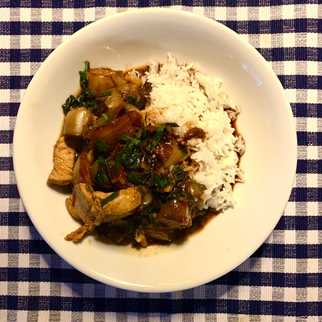 Die Hühnchenbrust in kleine Stücke schneiden und mit ca. 2 EL Wasser, 1 TL Rapsöl, 1.5 TL Sojasauce (light) und einem gut gehäuften TL Maisstärke vermischen und beiseite stellen. Ich mariniere das Fleisch immer frühzeitig (ca. 1-2 Stunden vorher), dann wird es schön zart und weich beim Anbraten. Den Wok stark erhitzen, grosszügig Öl hineingeben und heiss werden lassen. Die Fingerauberginen (in ca. 2 cm lange Stücke geschnitten) in den Wok geben und für mehrere Minuten unter dem Deckel anbraten, diesen wegnehmen, es folgen einige Minuten offen. Dabei immer gut umschichten, dies mehrmals wiederholen, bis sämtliche Auberginen weich sind und eine goldbraune Farbe angenommen haben – dann beiseite stellen. Wieder etwas Öl in den Wok giessen und kurz das Hühnchenfleisch von allen Seiten anbraten, ebenfalls beiseite stellen wenn fertig. Im letzten Schritt nochmals etwas Öl heiss werden lassen und mit dem kleingehackten Knoblauch, den weissen Teilen der Frühlingszwiebeln und dem Thai-Basilikum unter Rühren anbraten, Auberginen und Hühnchen dazu geben. Nun mit dem Shaoxing-Wein ablöschen und direkt im Anschluss die Saucenzutaten hinzufügen (mehr oder weniger nach Mengenangabe siehe oben, aber auch immer nach Gefühl): Fischsauce, Zucker, Soja-Saucen, Sesamöl und weissen Pfeffer, gut mischen. Die grünen Anteile der Frühlingszwiebeln hinzugeben und mit der Hühnerbrühe aufgiessen, jetzt den Bratensatz im Wok lösen, leicht köcheln, bis alles gut vermischt und der grösste Anteil der Flüssigkeit von den Zutaten absorbiert ist. Mit Basmati/Jasmin-Reis servieren. Fertig! Los! Essen!