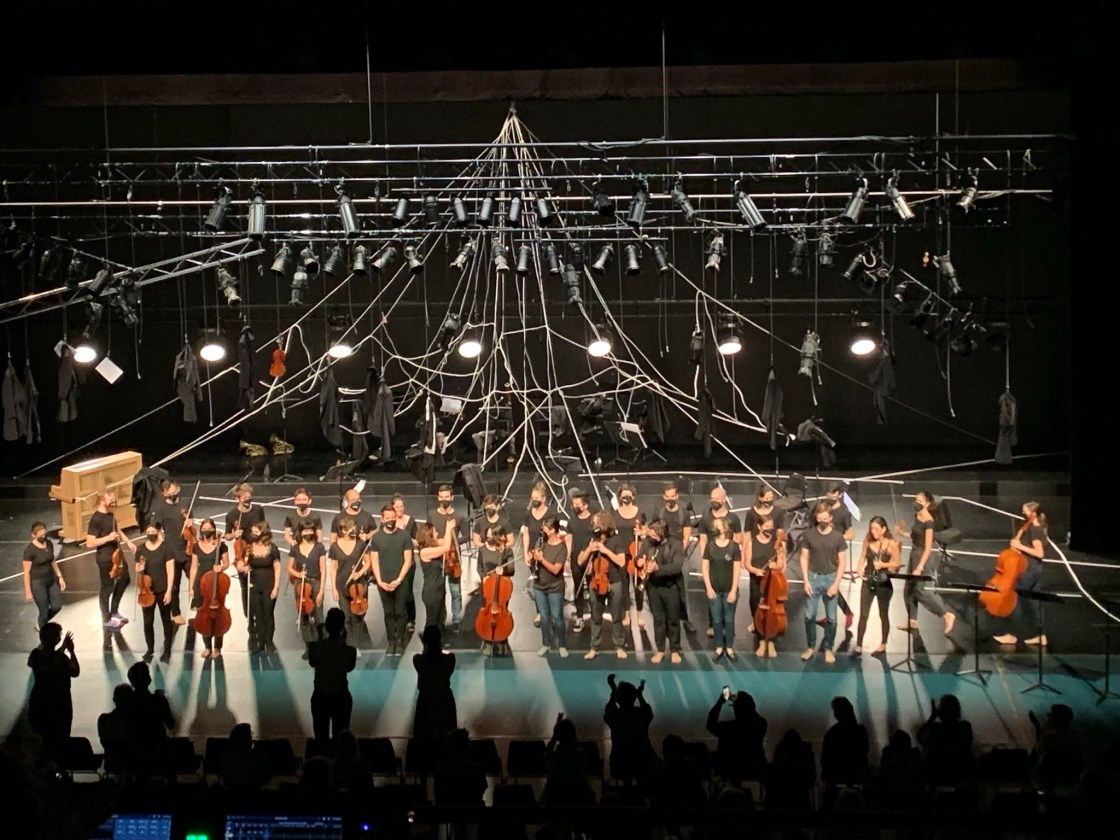 Der Vorhang ist noch geschlossen, man hört das stetig lauter werdende Ticken eines Metronoms und wie ein Scanner fährt eine Projektion über die Bühne, der Saal dunkelt ein und los geht es mit dem immer wieder wunderbaren Stück „The Unanswered Question“ von Charles Ives. Es folgen collagiert Stücke von Haydn, Bach, Cage (grossartig Kopatchinskaja mit 3 weiteren Musikern und dem extrem rhythmischen und kraftvollen „Once upon a Time“, geflüstert, gesungen, fast schon ausgespuckt – ein Text von Gertrude Stein) und Kurtág, bevor es dann zum aussergewöhnlichen Hörerlebnis des Beethovenschen Violinkonzertes übergeht. Hier spielt Kopatchinskaja nicht nur die Kadenz, sondern duelliert sich förmlich solistisch mit weiteren Musikern, sie dirigiert das LUCERNE FESTIVAL CONTEMPORARY ORCHESTRA und dirigiert es doch nicht, vielmehr geht sie darin auf, in der Bewegung und musikalisch. Am Ende senken sich fast schon apokalyptisch die Licht-Trassen vom Schnürboden, Nebel wabert auf die Bühne, zu hören ist eine gescratchte Soundcollage aus diversen Werken u.a. wohl auch Beethovens 9. Sinfonie und weitere Versatzstücke, die Musiker verlassen zu den sphärischen wunderbaren Klängen von Pauline Oliveros „Horse Songs from Cloud“ in einer Aufführung mittels der Handy-App von Levy Lorenzo. Der Saal und die Bühne dunkeln ein, zu sehen sind nur noch die dahingleitenden leuchtenden Handy-Bildschirme, man ist im digitalen Konzertzeitalter angekommen – es folgt Stille. Ein grosser Konzertmoment!