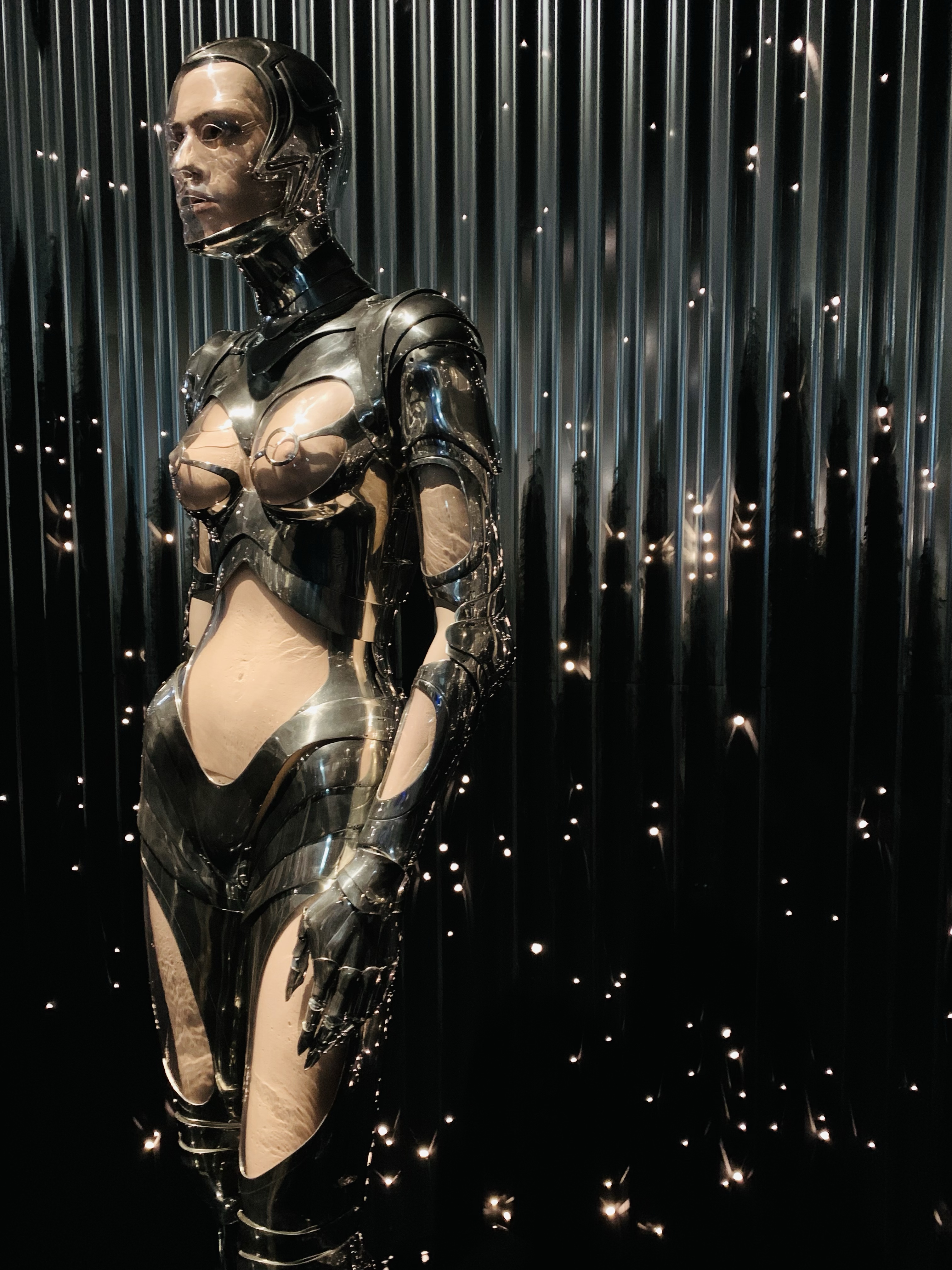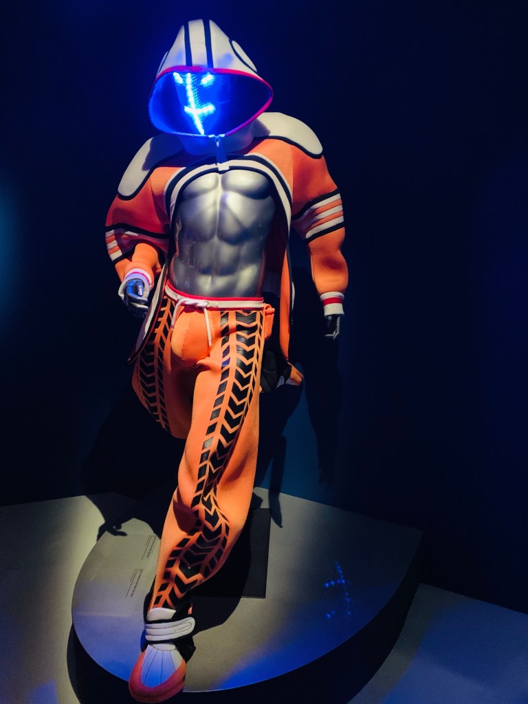 Die Ausstellung, die seit 30.9.21 im MAD Paris zu sehen ist, wurde vom Montrealer Museum der Schönen Künste (MMFA) produziert und ist als Wanderausstellung konzipiert. In Paris ist es natürlich ein Heimspiel für Thierry Mugler, der zu Beginn des neuen Jahrtausends nach New York ging, sich 2002 aus der Modewelt zurückzog, durch Bodybuilding und kosmetische Operationen eine neue Identität erschaffte und sich seit 2007 „Manfred“ nennt. 2013 gab es von ihm in Paris die Show „Mugler’s Follies“ zu sehen, zuletzt stattete er eine Revue im Berliner Friedrichsstadtpalast aus: „The Wyld“. Hier war er auch als Autor und Regisseur tätig. Mugler war schon immer mit dem Entertainment verwurzelt und arbeitete für Bühnenshows (z.B. 2009 Beyoncé oder 2003 Cirque du Soleil) und Videoclips, der bekannteste ist wohl George Michaels „Freedom“ mit allen grossen Models dieser Zeit, seinerzeit aufregend und künstlerisch ein absolutes Novum. In der Modewelt hatte Mugler seine Glanzzeiten Ende der Achtziger, Anfang der Neunziger. Mit dem Einstieg in sein Unternehmen bzw. der Übernahme durch Clarins und dem aufkommenden Minimalismus in der Mode begann der Abstieg. Die Ausstellung zeigt die grosse Bandbreite seines Schaffens – von futuristischen Kostümen aus Metall, über grosse dramatische Ausstattungen mit der für ihn typischen schmalen Taille, bis hin zu eleganten Klassikern mit riesigen Schulterpolstern, Latex und Nieten, quasi ein kompletter Querschnitt der Achtziger Jahre. Zu sehen sind auch Videos seiner grossen Shows mit den damaligen Topmodels Naomi Campbell, Claudia Schiffer, Linda Evangelista bis hin zu Cindy Crawford und Jerry Hall. Die Ausstellung ist ein „Must see“ für alle Fashionistas, aber auch für Mode-Laien sehenswert. In heutigen Zeiten, wo die grossen Modethemen Nachhaltigkeit, Ökologie, aber (leider) auch Fast-Fashion lauten, kommt man sich inmitten dieser glamourösen Glitzer-Glitter-Flitter-Ausstellung ein wenig seltsam vor. Sie zeugt von vergangenen Zeiten, von grossen Namen, aber auch von einer Epoche, die definitiv vorbei ist. Neben den Ausstellungsstücken gibt es auch interessante Besucher von ganz jung bis uralt zu beobachten, in Gruppen, im Rollstuhl, aufgetakelt, im Business-Outfit und im entspannten Freizeitdress – Mode ist eben universell…