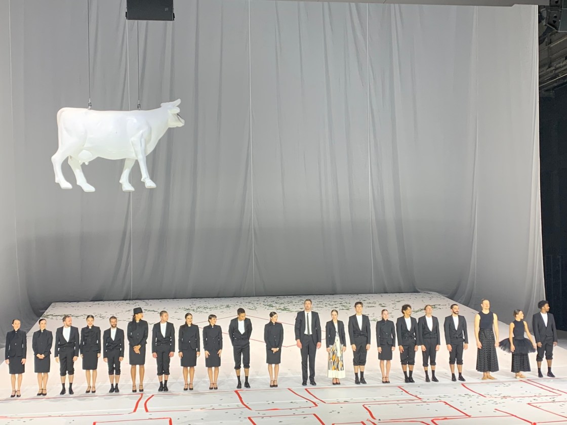 2016 an der Semperoper Dresden uraufgeführt und mit dem deutschen Theaterpreis „Faust“ ausgezeichnet, hatte „COW“ am Theater Basel 2019 seine Schweizer Erstaufführung. Wer selbst in der Theaterblase tätig ist, wird seinen Alltag in dem absurden Abend von „COW“ wiederfinden, denn hier wird der Theaterbetrieb etwas aufs Korn genommen, köstlich der Filmeinspieler von T. M. RIVES über den Entstehungsprozess, hier wird ernsthaft hinterfragt, untersucht und ausgeleuchtet, was es an Feld- und Milieustudien zum Thema „Kuh“ braucht, immer wieder (herrlich) FRANK FANNAR PEDERSEN als blöd glotzende und /oder bequem auf der Weide liegende Kuh, die sich auch mal langsam durch die Flure, die Kantine und Werkstätten des Theaters Basel bewegt oder gemeinsam mit dem Ensemble durch Basels Altstadtgassen marschiert, wenn der Herdentrieb (des Ensembles) analysiert wird. Und am Ende endloser, aber äusserst wichtiger Schwafelei bleibt dann eben doch der kurze Satz „äh, was war eigentlich die Frage“ im Raum stehen. Das ist für alle Theaterschaffenden herrlich und selbstironisch, für alle anderen Zuschauer einfach ein witziger, absurder und assoziativer Abend. Grosse archaische Ensembles, die stellenweise an tanzende Derwische erinnern, wechseln sich ab mit minimalistischen Duos – auch hier wieder mit der herrlichen Selbstironie und eingeblendeten Fragen, die sich der Choreograph stellt: „ist das ausdrucksstark genug?“, „sind zwei Tänzer ausreichend oder braucht es noch einen Dritten?“ oder „Ist das Ganze einprägsam und nachhaltig?“. Und immer wieder überrascht Ekman mit witzigen Details und Ideen, wie etwas das Ensemble mit an Hufe erinnernden Schuhen und den entsprechenden Geräuschen auszustatten. Überhaupt sind die Kostüme von HENRIK VIBSKOV auf den Punkt, ebenso die grossartige Musik von MIKAEL KARLSSON. Zu viel muss man aber gar nicht in diese Produktion interpretieren – Ekman selbst sagt über seinen abendfüllenden Abend: „Anstelle einer Story gibt es ein Motiv: die Kuh. Zunächst war ich einfach nur gefesselt von der Symbolkraft der Kuh. Sie kann als Metapher für so vieles gelten. Meiner Meinung nach ist die Kuh nicht einfach nur ein interessantes Tier, nein, sie repräsentiert die Möglichkeit des reinen Seins. Und damit ist sie genau das Gegenteil von Ballett, in das wir oft so angeblich Wichtiges hineininterpretieren. Ich habe die Kuh deshalb neben den Tanz gestellt – und auf diese Weise wurde sie zu so etwas wie einer Erinnerung. Sie erinnert uns daran, dass auch wir Menschen eigentlich ganz einfache Lebewesen sind.» Und so kann man den Abend in seiner ganzen Absurdität einfach auf sich wirken lassen und sich an den vielen lauten und archaischen Momenten erfreuen, „Cow“ bietet aber ebenso viele Momente der Ruhe und stellenweise sogar wohltuende Langsamkeit. Man muss sich darauf einlassen. Der Genuss kommt dann von ganz alleine. Viele Details wird man in seiner neueren wundervollen Arbeit „PLAY“ wieder finden, die in Paris 2017 ihre Uraufführung hatte und Zuschauer und Kritik begeisterte. Die ganz eigene Tanzsprache Alexander Ekmans ist ein Erlebnis der ganz besonderen Art.