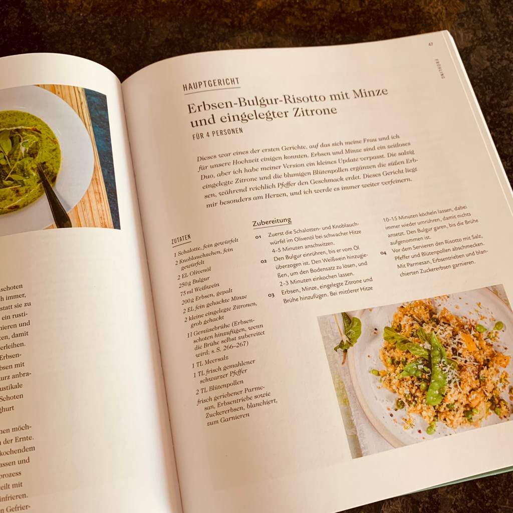 Wie es manchmal aber so ist, kommt dieses Kochbuch mit mehr Schein als Sein daher und ich habe mit anderen, thematisch ähnlich gelagerten Kochbüchern bessere Erfahrungen gemacht. Strawbridges Rezeptauswahl klingt auf den ersten Blick super, manches löst sich für den Alltag jedoch nicht ein (z.B. Champignons, die über offenem Lagerfeuer zubereitet werden…). Häufig ist es leider zu viel ChiChi und zu wenig Substanz. Die ausprobierten Gerichte „Fenchel und Haloumi“ und das „Erbsen-Bulgur-Risotto mit Minze und eingelegter Zitrone“ waren solide, haben uns aber nicht wirklich überzeugt.