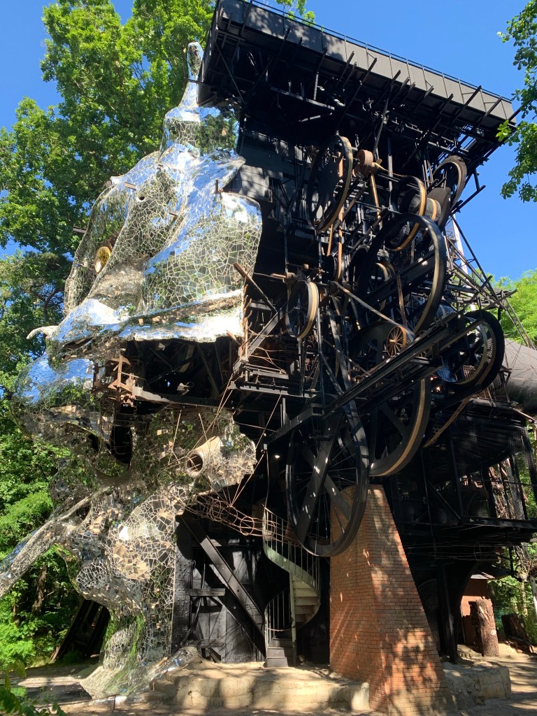 Fährt man von Fontainebleau in Richtung Chartres, so findet sich ein unaufgeregt kleines Schild am Strassenrand mit dem Hinweis auf dieses wundervolle Kunstwerk Tinguelys mitten im Bois de Pauvres bei Milly-la-Forêt. Da „Le Cyclop“ für mich eine persönliche Bedeutung hat und ich das Werk schon immer sehen wollte, biegen wir also nach rechts ab, parken das Auto, gehen noch 10 Minuten zu Fuss und dann steht er da in voller Grösse, sein Auge leuchtet und das von Niki de Saint Phalle komplett mit Spiegeln verzierte Gesicht ist schon von weitem durch die alten Bäume zu sehen. Was für ein erhabener Moment: LE CYLOP (oder auch „Le Monstre“ oder „La Tête“) steht vor uns in voller Grösse, das sind immerhin imposante 22.5 m. Das grosse Tor öffnet sich um 10.30 Uhr und wir haben sofort die Möglichkeit einer Führung (mit einem jungen und hochmotivierten Mann) durch das Innere der Skulptur. Der Cyclope entstand zwischen 1969 und 1994 unter Beteiligung vieler Beiträge von Freunden aus Tinguelys „Kunstfamilie“ – Daniel Spoerri, Jean-Pierre Raynaud, Eva Aeppli, César, Arman sowie vielen anderen internationalen Künstlern und natürlich Niki de Saint Phalle. Besonders erwähnenswert ist der ebenfalls Schweizer Künstler Bernhard Luginbühl, von dem das riesige Ohr der monumentalen Skulptur stammt. Seit 1987 ist die Skulptur im Besitz des Staates, der sich nun auch um den Erhalt kümmert. Nach zwei Jahren Schliessung aufgrund Restaurierung und Corona ist er nun wieder zugänglich, dieser wunderbare Cyclope inmitten des Waldes.
