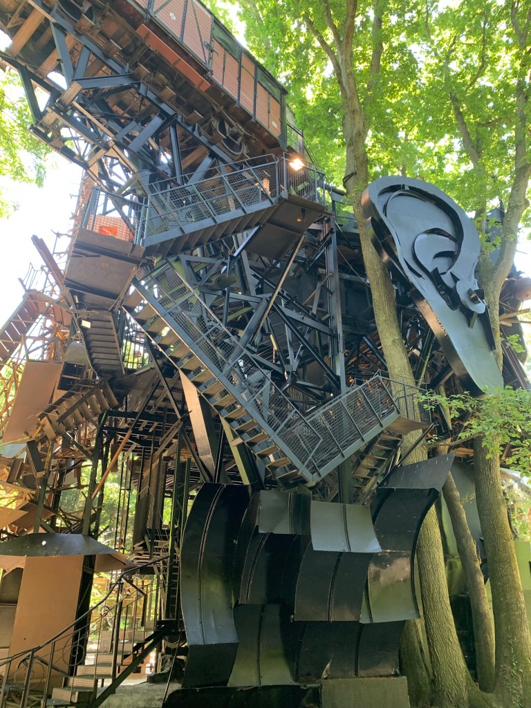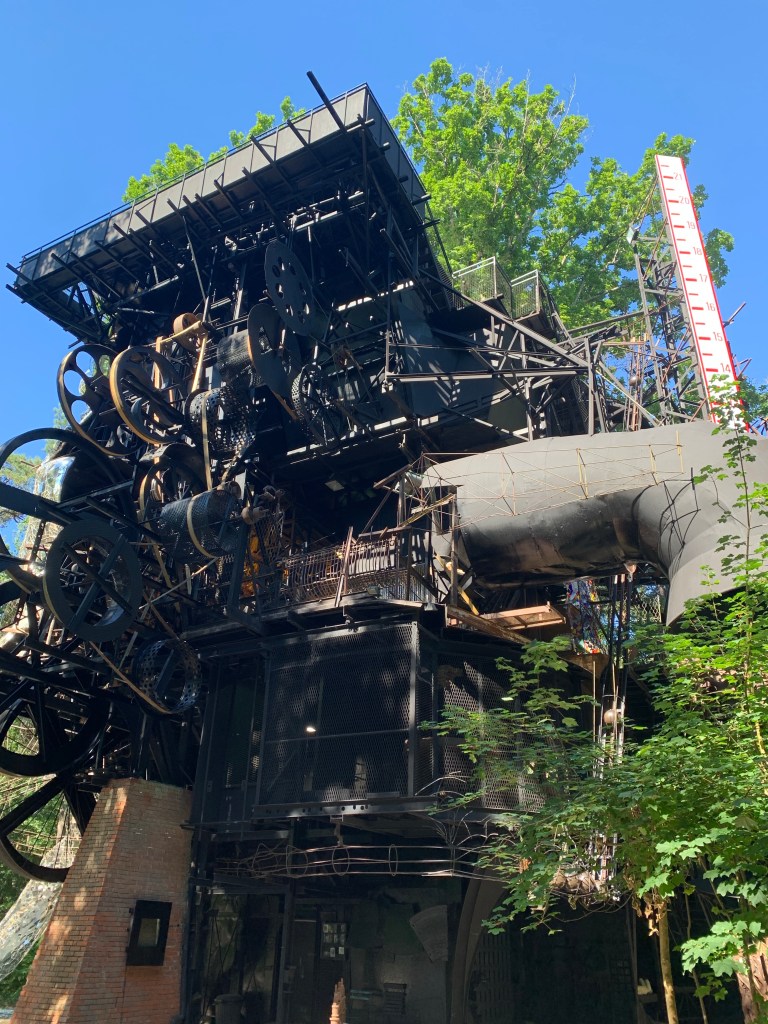 Die rund 300 Tonnen schwere Skulptur wirkt trotz ihrer Masse erstaunlich filigran, windet sich um einen alten massiven Eichenbaum und besteht überwiegend aus Eisen und Beton sowie unzähligen Spiegelscherben, mit denen das Gesicht gestaltet wurde, samt seiner riesigen Wasserrutschbahnzunge. Das Material reflektiert den Wald und verankert die Skulptur in seiner Umwelt. Begeht man das Innere, so begegnet man dem imposanten Gehirn, einem typischen Tinguely-Räderwerk, laut, krachend und beeindruckend, sobald es in Bewegung kommt, Kugeln schiessen wie Gedankenblitze an uns vorbei. Desweiteren gibt es ein kleines Theater im dritten Stock, einen Eisenbahnwagon, verschiedene Klanginstallationen und im ersten Stock den Fliessenboden (ebenfalls von Niki de Saint Phalle), der an die Schachbrettflaggen der Autorennen erinnert, die Tinguely so liebte. Am höchsten Punkt der Skulptur, quasi über dem Gehirn wurde eine kleine Wasserfläche installiert, in der sich der Himmel, die Sterne oder auch – je nach Jahreszeit – die Blätter der umliegenden Baumkronen spiegeln. Schwindelfrei sollte man sein. Aber letztendlich ist man einfach hingerissen von der Schönheit in Tinguelys Kunst, da wird alles andere nebensächlich.