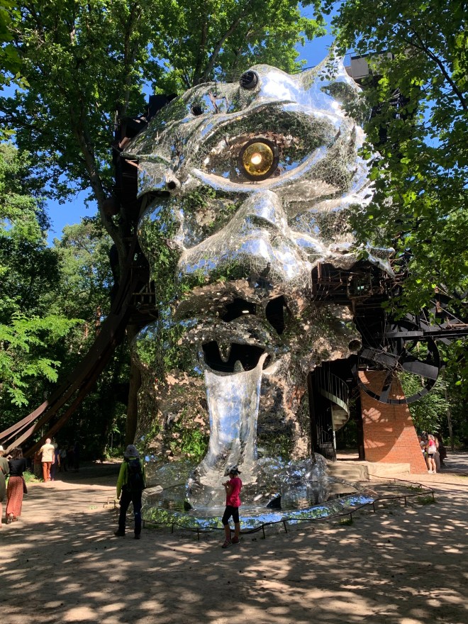 Fährt man von Fontainebleau in Richtung Chartres, so findet sich ein unaufgeregt kleines Schild am Strassenrand mit dem Hinweis auf dieses wundervolle Kunstwerk Tinguelys mitten im Bois de Pauvres bei Milly-la-Forêt. Da „Le Cyclop“ für mich eine persönliche Bedeutung hat und ich das Werk schon immer sehen wollte, biegen wir also nach rechts ab, parken das Auto, gehen noch 10 Minuten zu Fuss und dann steht er da in voller Grösse, sein Auge leuchtet und das von Niki de Saint Phalle komplett mit Spiegeln verzierte Gesicht ist schon von weitem durch die alten Bäume zu sehen. Was für ein erhabener Moment: LE CYLOP (oder auch „Le Monstre“ oder „La Tête“) steht vor uns in voller Grösse, das sind immerhin imposante 22.5 m. Das grosse Tor öffnet sich um 10.30 Uhr und wir haben sofort die Möglichkeit einer Führung (mit einem jungen und hochmotivierten Mann) durch das Innere der Skulptur. Der Cyclope entstand zwischen 1969 und 1994 unter Beteiligung vieler Beiträge von Freunden aus Tinguelys „Kunstfamilie“ – Daniel Spoerri, Jean-Pierre Raynaud, Eva Aeppli, César, Arman sowie vielen anderen internationalen Künstlern und natürlich Niki de Saint Phalle. Besonders erwähnenswert ist der ebenfalls Schweizer Künstler Bernhard Luginbühl, von dem das riesige Ohr der monumentalen Skulptur stammt. Seit 1987 ist die Skulptur im Besitz des Staates, der sich nun auch um den Erhalt kümmert. Nach zwei Jahren Schliessung aufgrund Restaurierung und Corona ist er nun wieder zugänglich, dieser wunderbare Cyclope inmitten des Waldes.