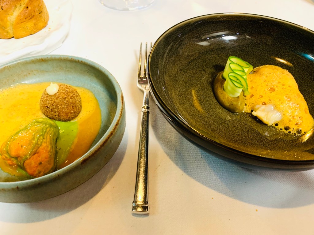 AU RYTHME DES SAISONS: Cabillaud du Finistère: Effeuillés de cabillaud, jeu de texture avec la pomme de terre, coulis de cresson et œufs de truite —- L‘œuf mollet à la truffe: Œuf mollet puis frit, crème cru de Thyphaine aux herbes, girolles, amandes fraîches, abricot et truffes tuber Aestivum —- Homard bleu: Le corps rôti au beurre de curry, le coude en croquette, la pince pour garnir la fleur de courgette, crème de courgette grillée et bisque de homard —- Carré de veau du Finistère: Tranche de cœur de carré de veau rôti, ravioles d‘aubergines aux Brin d‘amour, coulis de piquillos et jus de veau au poivrons vert —- La douceur de Lait: Le dessert emblématique du Chef – Mousse de riz au lait, confiture de lait, créme glacée à la Vanille et opaline au lait