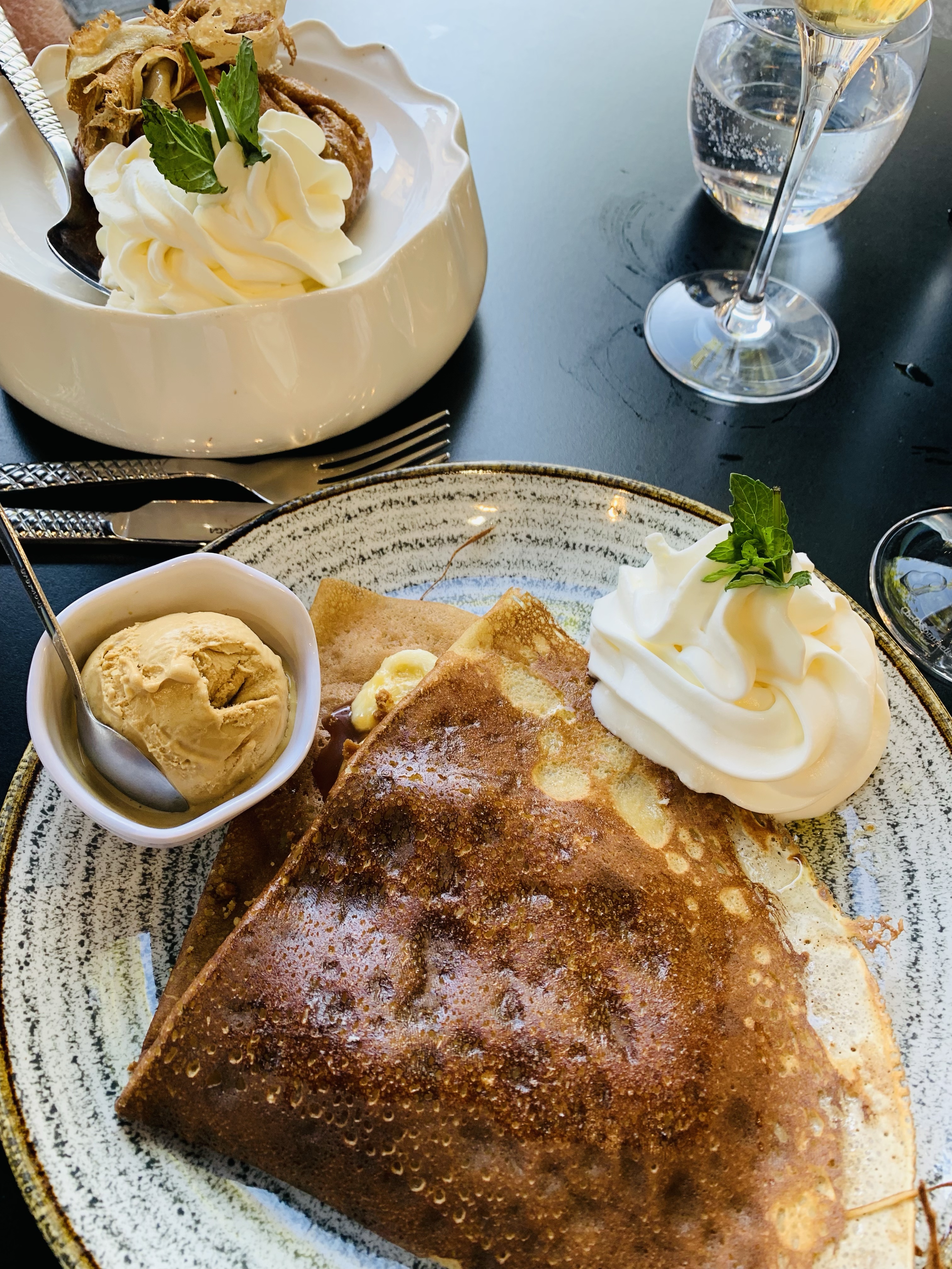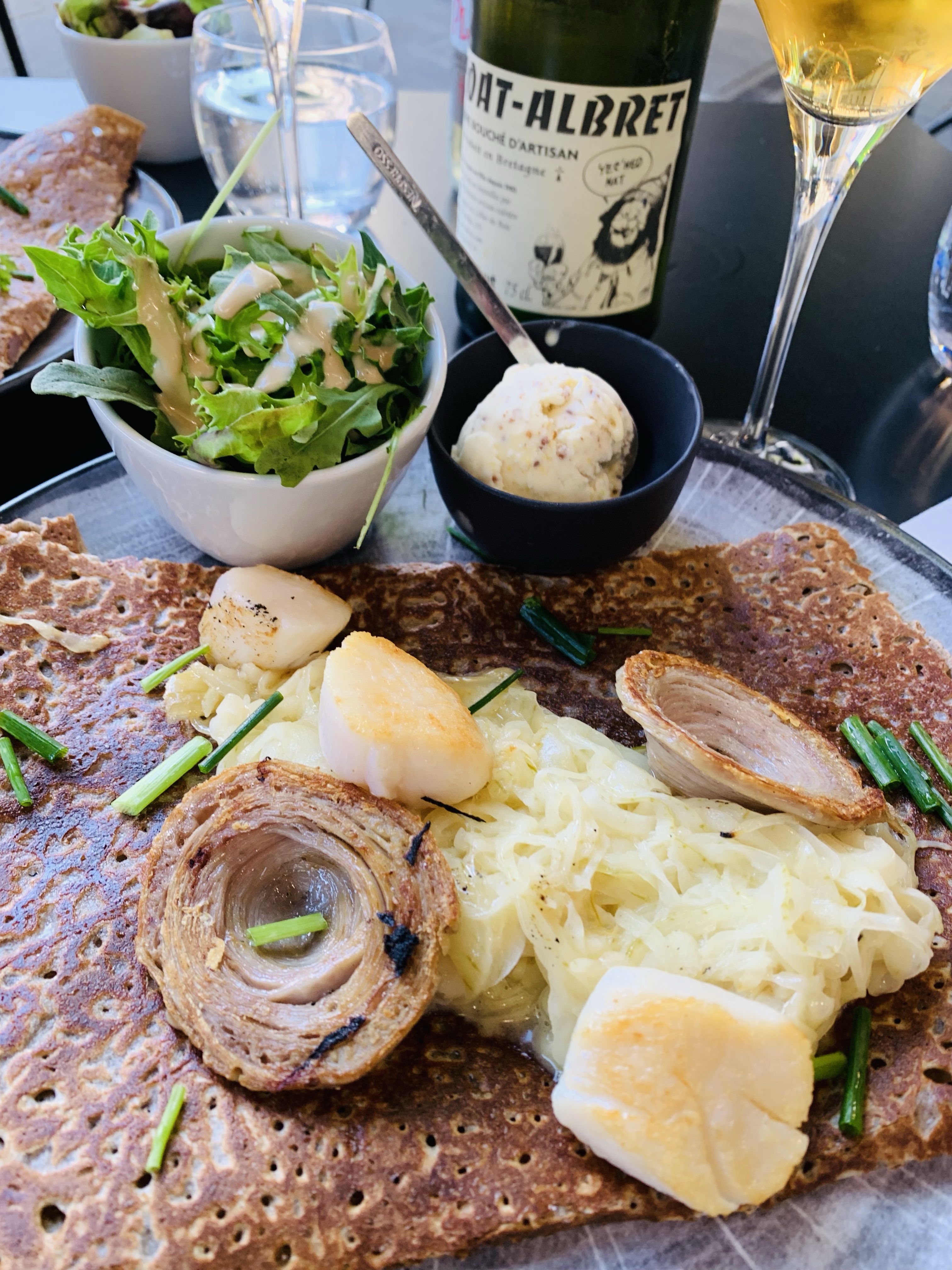 Galette MEN DU: Andouille de Guéméné et Saint-Jaques, fondue d‘oignons, sauce poulette, glace moutarde à l‘ancienne – Crêpe BANOFFEE: Caramel au beurre salé maison, banane, glace caramel, chantilly, biskuit breton maison
