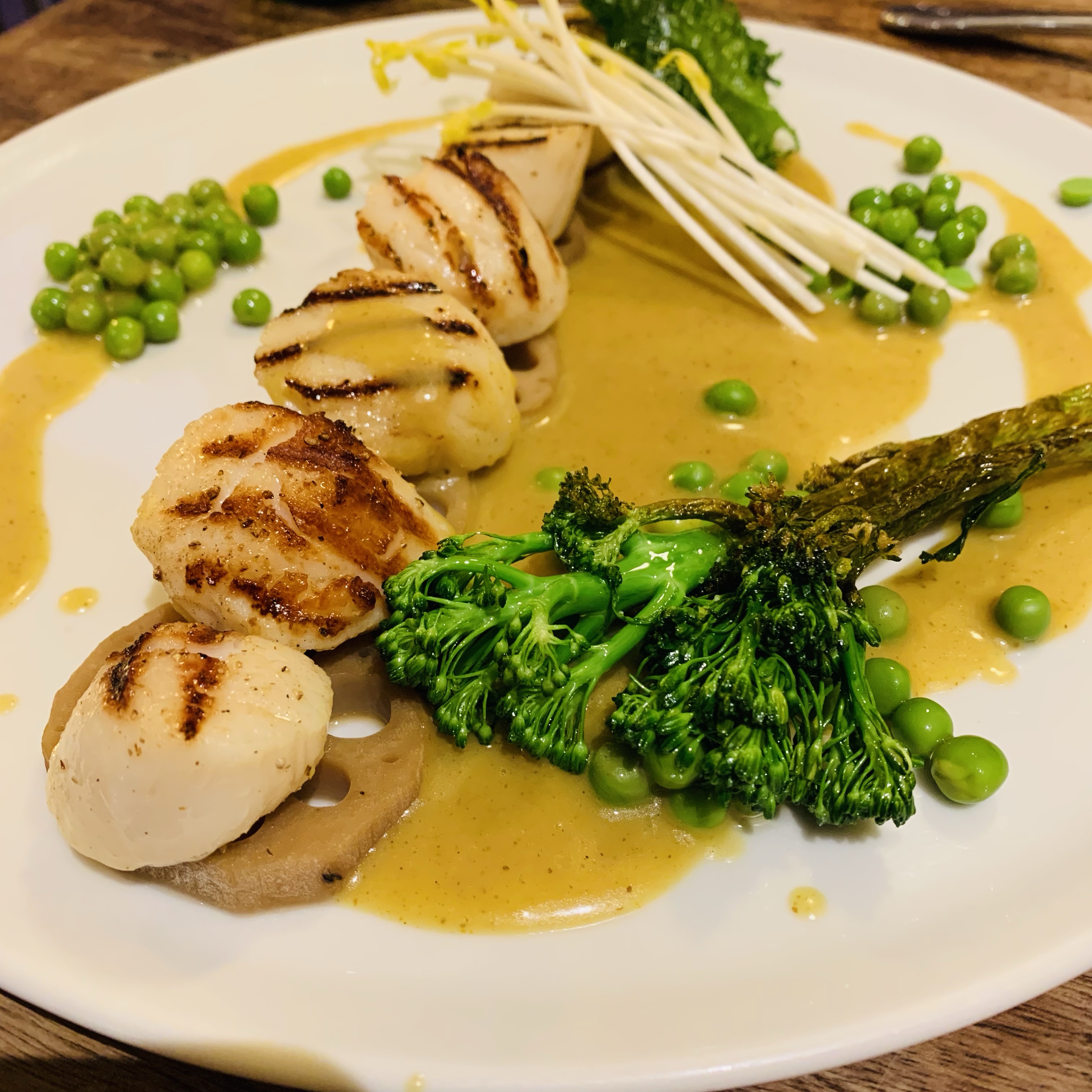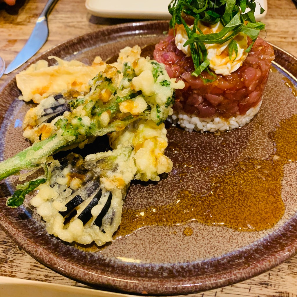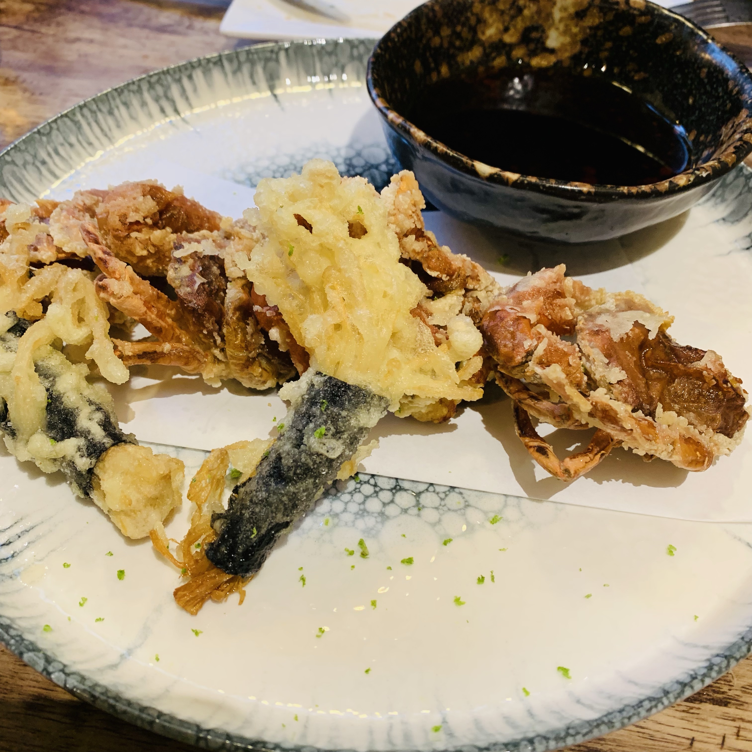 Edamamé – Eringui grillés – Menchi_Katsu au cœur comté – Crabes mous frits, tempura de nori – Tartare de thon, œuf poché Bio, tempura de légumes – St. Jacques grillées, racines de lotus, petit pois, sauce coquillages-curry