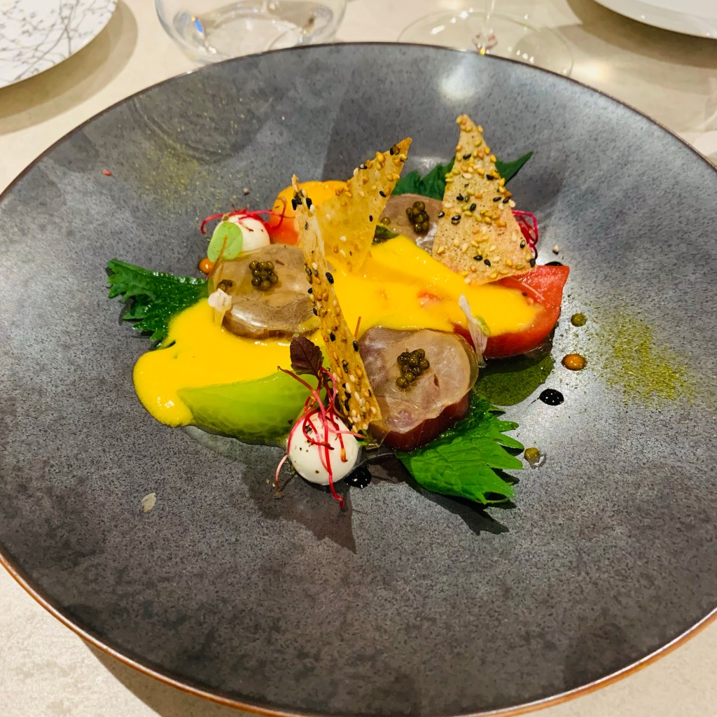 Gleich vorneweg:, das Signature-Dessert „ Miel & Safran d‘Auxonne“ war mein persönlicher Favorit. Selten habe ich so intensives Honigaroma erlebt – köstlich! Hummer und Kalbsbries waren vorzüglich, Kalbsbries ist allerdings nicht jedermanns Sache. Toll waren auch die Blinis mit dem Thon zur zweiten Vorspeise sowie die amuse bouches. Die frittierten Zucchiniblüten zur Lotte waren toll, wunderbar auch die Sesamchips zum Thon rouge mit der leicht säuerlichen Gazpacho von Tomate und Ananas. Die Weinempfehlungen, allen voran der Montagny waren herrlich. Klingt jetzt alles sehr begeistert und es war auch ein sehr schönes gut dreistündiges Dinner, dennoch bleibt ein leicht unbefriedigendes Gefühl zurück. War die Erwartungshaltung zu gross oder war dies einfach – wie das eben manchmal so ist – eine Laune des Moments? Anyway, hervorragender Service, gediegenes Ambiente und ein interessantes Menü aus dem Burgund mit subtilen asiatischen Aromen. Wohlverdiente Gault Millau – Hauben für Tomofumi Uchimara und sein Team!