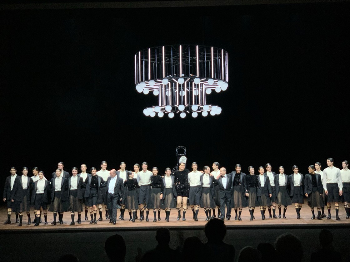 Marcos Morau, der sich selbst als interdisziplinärer Mensch versteht und mit seiner Kompanie „La Veronal“ interdisziplinär Produktionen erarbeitet, vereint in „Nachträume“ die unterschiedlichsten Genres, die Produktion weckt vielerlei Assoziationen – man fühlt sich an die grauen Herren der Zeit in Michael Endes „Momo“, an die Aufmärsche in Pink Floyds „The Wall“, erinnert, auf alle Fälle immer- und fortwährend an Macht mit faschistischen Tendenzen, an Gruppierungen, an unterlegene und überlegene Menschen, an Menschen, die für ihre Karriere Kapital daraus schlagen. Grossartig die Bewegung der Massen, bestechend auch die vielen Details in kleinen Gruppen und Paarungen, denen man gar nicht allen folgen kann, so viel gibt es eineinhalb Stunden lang zu sehen. Das komplette Ensemble permanent im Einsatz, was für eine Energie, die man bis in die letzten Reihen spürt. Es stimmt einfach alles, die Idee, das Konzept, die grossartigen Kostüme und Perücken, das Setting mit dem riesigen futuristischen Lüster, der ein wenig an ein Raumschiff erinnert und multipel bespielt wird und dann natürlich der grosse runde Tisch, eine Reminiszenz an das Stück von Kurt Joos „Der grüne Tisch“ von 1932, in dem er den ersten Weltkrieg behandelt – auch heute, 90 Jahre später, aktueller denn je. Der Tisch als Machtzentrum, hier wird geredet, gestritten, verteilt, entschieden. Das Stück und seine grossartigen Musiken von CLARA AGUILAR, Musik-Collagen (von Hollaender bis freejazz), Atmosphären, Zitaten und Livemusiken (wunderbar HEINZ DELLA TORRE an der Trompete/LUIGI LARGO am Klavier) raubt dem Zuschauer fortwährend den Atem, man kommt nicht zur Ruhe, permanent gibt es kraftvollen Tanz und stampfende Rhythmen, einfallsreiche Details und als grossartige Klammer dieser Produktion den unglaublichen RUBEN DROLE als genderfluides Wesen, als Königin, als Herrscherin, als DIE Macht schlechthin. Wuchtig, kraftvoll präsent und doch bezaubernd einfühlsam und sanft wie etwa in Schuberts „Nacht und Träume“ umringt von lieblichen Schafen irgendwo fernab im Universum. Gleichzeitig auch ein wenig schräg, erinnert er mich doch auch an Tim Curry als Frank-N-Furter in Richard O’Briens „Rocky Horror Show“. Der Schluss lässt dann alles offen für die Zukunft, wenn die Herrscherin alleine unter dem Lüster auf vielen Stühlen thront (oder ist es ein Scheiterhaufen?) und das komplette Ensemble an der Rampe steht und Kurt Weills Song „Wie lange noch?“ aus dem Jahr 1944 anstimmt. Diese Frage stellen wir uns derzeit häufig, wie lange wird es wohl noch gehen. „Nachtträume“ ist kraftvoll, bewegend, aufwühlend, zeitlos. Mehrere Vorhänge, Standing Ovations! Bravi!