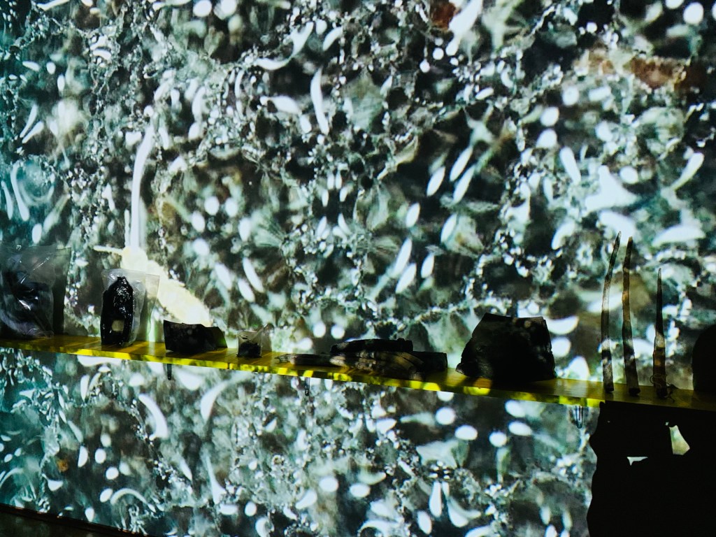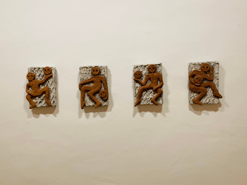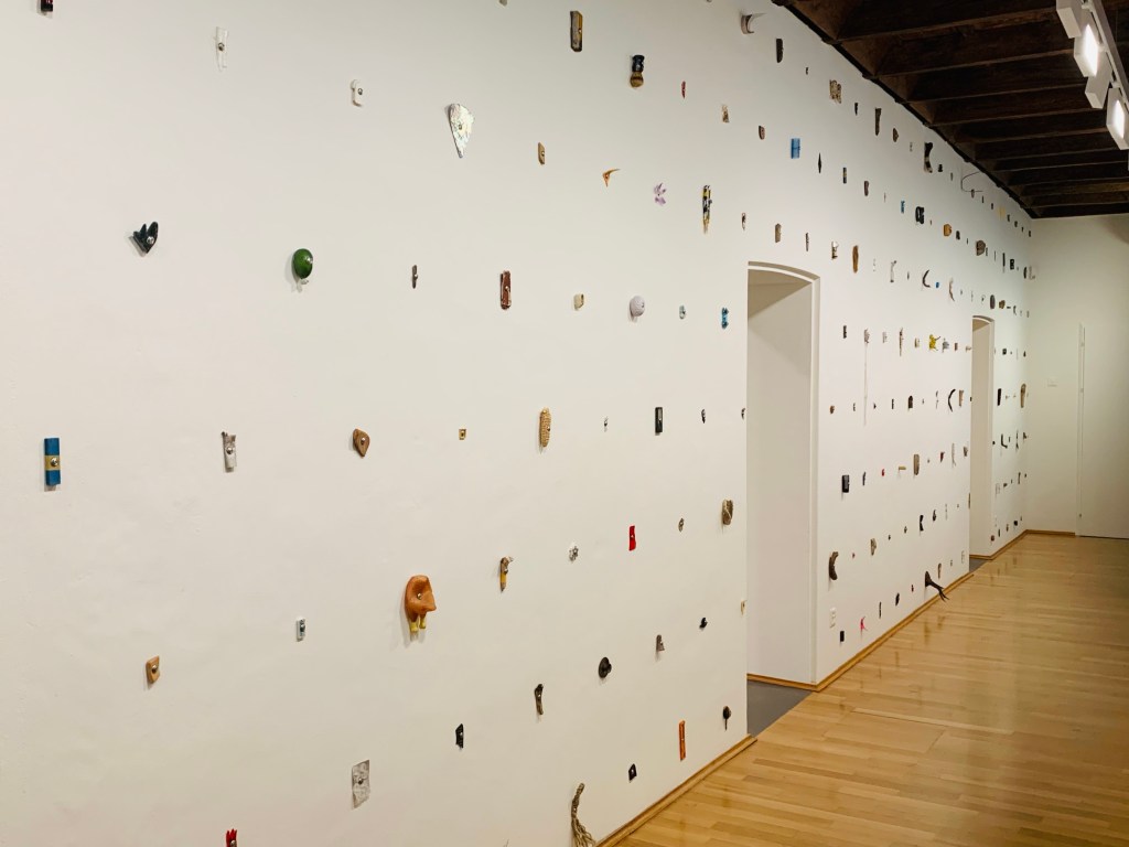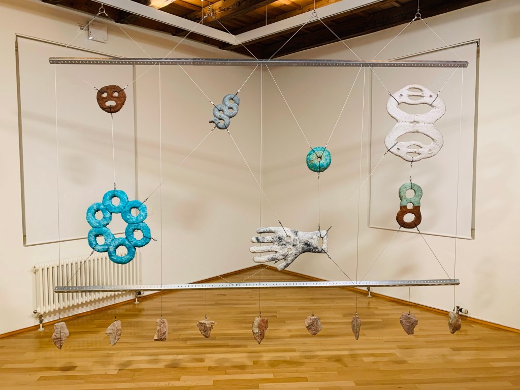 Grossartig auch die Steine aus Pappmaché im nächsten Raum – faszinierend die nachgebildeten Oberflächen und Strukturen. Und es geht weiter mit gesammelten und zu entdeckenden Objekten in der titelgebenden Arbeit „e spesso intendo tempre“ (1993-2022, work in progress) – eine Wunderkammer mit unzähligen kleinen Details. Zuletzt noch Arbeiten zum Knie als Körperteil, dem eher wenig Aufmerksamkeit widerfährt sowie Arbeiten zu Mythen, Rituale und Kultobjekte mit einer interessanten Installation aus mehreren Elementen, die durch Stahlseile verbunden sind und die wie ein geheimnisvolles Ideogramm wirkt. Im Einleitungstext zur Ausstellung steht die Frage „Haben Sie sich jemals gefragt, worin der Unterschied zwischen „Sehen“ und „Betrachten“ besteht? Die Arbeiten von Lucas Herzig regen an, sich selbst diese Fragen zu beantworten.