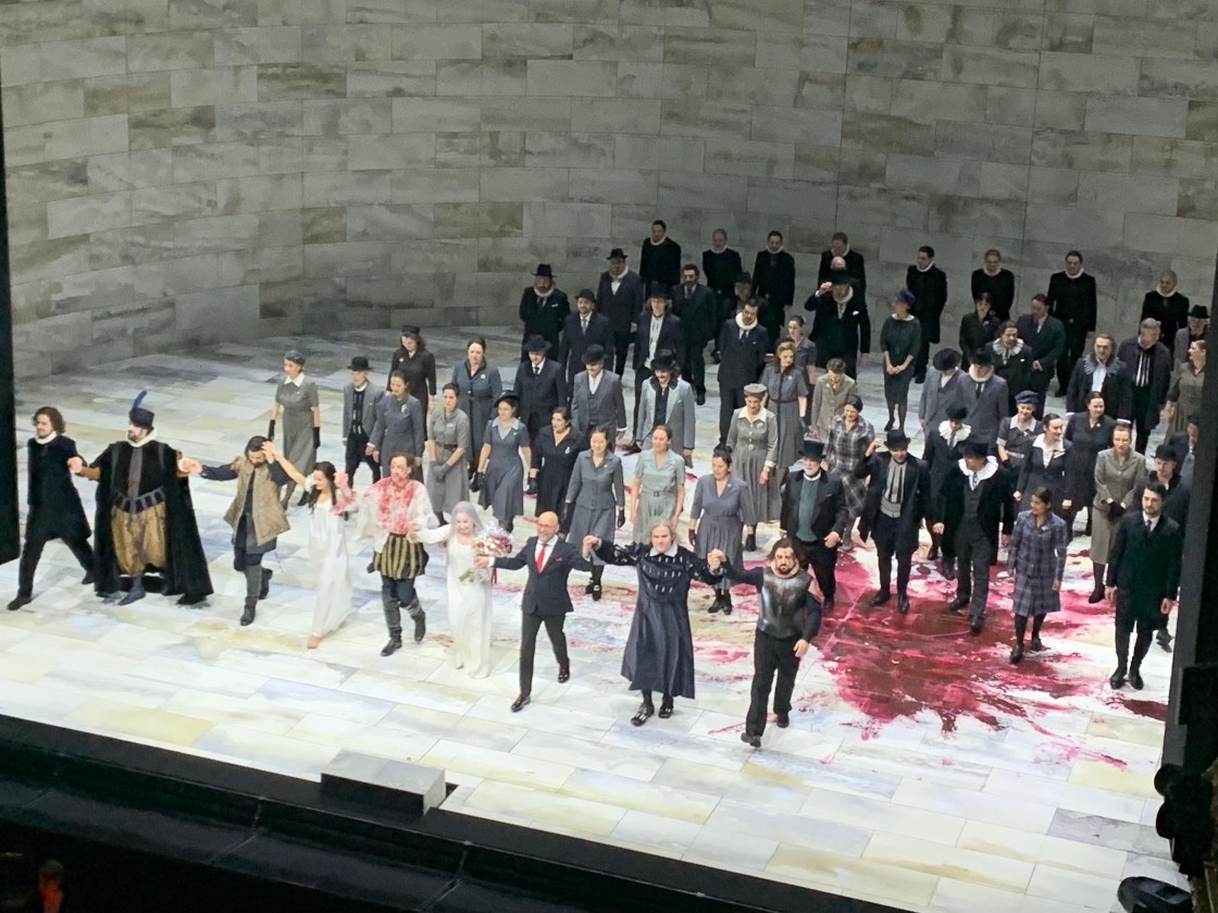 Einen Erzählbogen bilden die drei Werke natürlich schon: Da ist „Anna Bolena„, die von Tudor-König Heinrich VIII verlassene und dann enthauptete Gemahlin und deren Tochter und spätere Königin Elisabeth I, die dann in „Maria Stuarda“ gegen ihre Rivalin kämpfen muss und zuguterletzt die gealterte Königin Elisabeth I, die vermeintlich kaltherzig auf ihre alten Tage wohl doch nochmals Liebesgefühle entdeckt, die Verletzung und Enttäuschung dann jedoch in der Hinrichtung des geliebten Roberto Devereuxs endet. Donizetti ist Belcanto und Gesangskunst vom Feinsten und benötigt ein hervorragendes Sängerensemble. Ursprünglich angekündigt sollte Diana Damrau alle drei Königinnen singen, in der Premiere in Zürich war nun die lettische Sopranistin Inga Kalna (erstmals in Zürich als Madame Lidoine in Poulencs „Dialogues des Carmélites“ zu sehen) als Elisabeth besetzt – vielleicht fühlt sich Frau Damrau einfach noch zu jung für ein alte Königin, wer weiss – Kalna ist jedoch, direkt nach der 2. Vorstellung indisponiert und mittlerweile bis auf weiteres durch ELENA MOSUC ersetzt. Für Elena Mosuc, die in Zürich immer ein wenig im Schatten der grossen Edita Gruberova stand, ist diese kurzfristige Übernahme nicht nur ihr spontanes Rollendebüt, sondern auch ein Triumph! Ihr gegenüber steht natürlich eine grossartige Besetzung: STEPHEN COSTELLO in der Titelpartie, herrlich sauber und frei in den Höhen (trotz angekündigter leichter Indisposition von ihm und Goryachova), ANNA GORYACHOVA als Sara – wundervoll ihr samtweicher, warm klingender Mezzo – und KONSTANTIN SHUSHAKOV als Nottingham mit seinem immer wieder wohltönenden Bariton. Am Pult der PHILHARMONIA ZÜRICH steht erneut ENRIQUE MAZZOLA, abermals mit grosser Erfahrung als Belcanto-Dirigent führt er das Orchester und seine Sänger:innen durch diese Produktion, gibt ihr viel Ruhe und Pausen, der Donizetti klingt farbenreich, empfindsam und wo nötig doch auch aufbrausend, wunderbar vielseitig – Mazzola ist hier wirklich ein grosser Spezialist und bringt diese Partitur zum blühen. DAVID ALDENs eher konventionelles Konzept geht auf, wie in den beiden ersten Produktionen dominiert die kahle Ausstattung aus weissem Marmor und einem verschiebbaren Rondell, was die Szenenwechsel mit vielen Schreibtischen und Pulten ermöglicht, an denen Verträge und Urteile aufgesetzt und unterschrieben werden müssen. Sitzt man im 2. Rang dominiert natürlich der riesige und nicht zu entfernende überdimensional grosse Blutfleck – Devereux ist wohl nicht der erste und einzige, der hier hingerichtet wurde, das ist sehr dominant in der Optik und brennt sich ein. Dazu wie bisher auch konventionelle Personenregie, viele Schattenwürfe und zumeist oberflächliche Plattitüden – gut gemachter Historienkram eben. Während die Protagonisten in prächtigen Kostümen agieren, ist der Chor erneut in Alltagskleidung des 18./19. Jahrhunderts zu sehen und singt erstaunlich sauber und hervorragend einstudiert (JANKO KASTELIC). Im Vergleich zu „Maria Stuarda“ und „Anna Bolena“ wirkt „Roberto Devereux“ fast noch statuarischer, auch wenn das Marmorrondell von der Technik permanent verschoben wird und vermeintlich etwas auf der Bühne passiert und – aus welchem Grund auch immer – Elisabeth I zum Finale auf einem Walkürenfelsen niedersinkt. Insgesamt also eher langweilige Szenerie, aber alleine wegen der letzten 20 Minuten lohnt sich der Besuch. Hier dominiert natürlich Elisabeth I alias Elena Mosuc – ihre Beweglichkeit in der Stimme, ihre wunderbar feinfühlige Interpretation in den leisen Tönen, aber auch die Wucht, mit der sie ihrem Gegenüber etwas entgegen zu schmettern vermag. Das ist wirklich grosse Kunst! Grosse Stimme, unglaubliche Präsenz! Wohlverdienter Ovationen und Blumenregen für Frau Mosuc am Ende der Vorstellung.