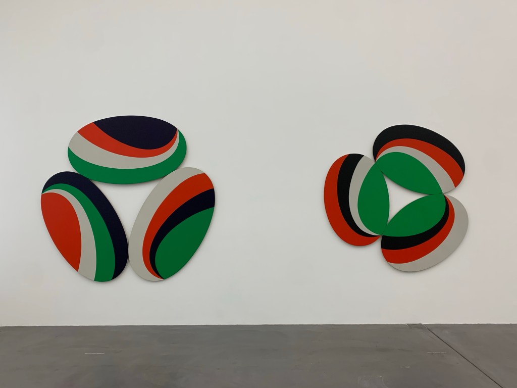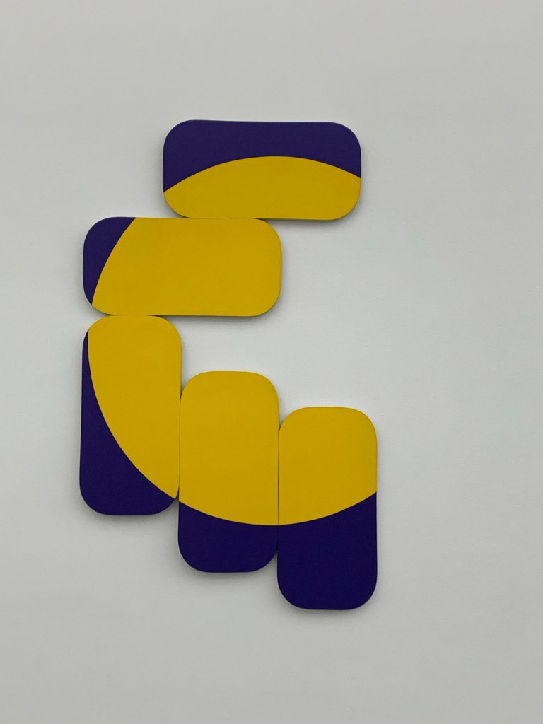 Wenn man geometrische Abstraktion mag, ist man hier richtig. Interessante Farbkombinationen (mein Favorit: Constallation Happy Day von 1971 in schwarz, rot, grün, weiss, gleich in der grossen Eingangshalle) und viel geometrische Formen sind zu sehen, viele runde und ovale Bildträger, aber auch zusammengesetzte Dreiecke, Quadrate und Rechtecke.