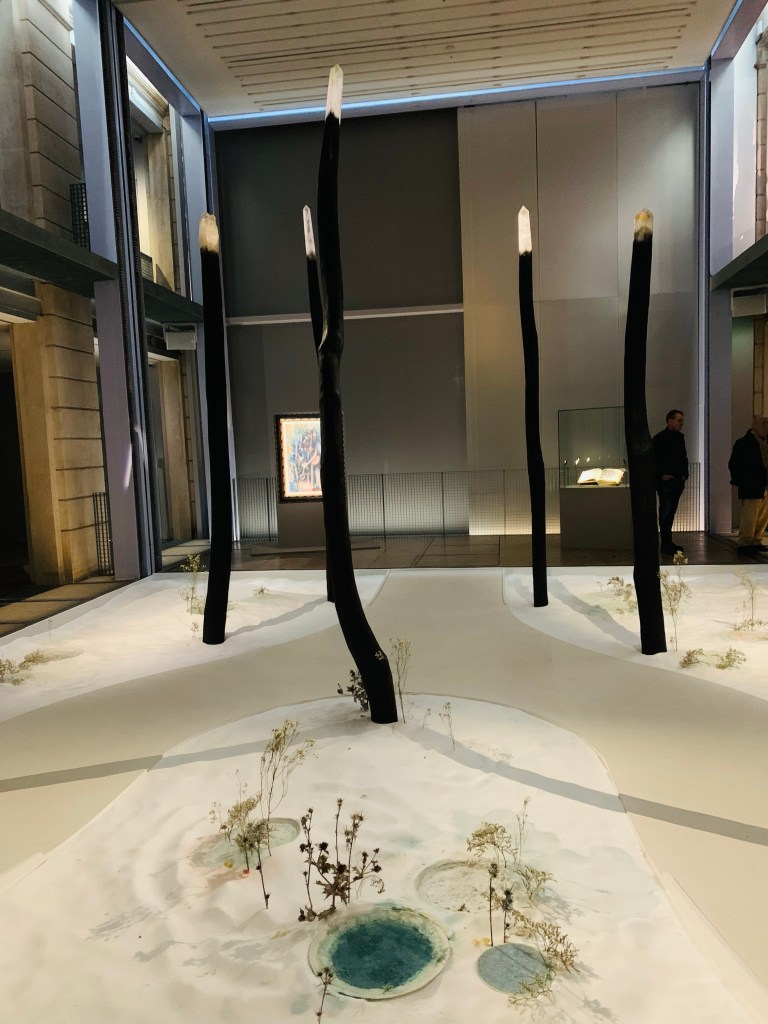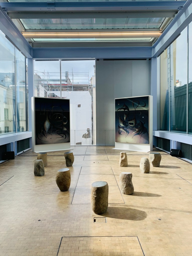 Der (spirituelle) Weg in dieser Ausstellung endet in der dritten lichtdurchfluteten Etage, diese letzte Station ist zeitgleich auch das Symbol für die Wiedergeburt, das letzte Stadium einer Verwandlung. Wem all dieser theoretischer Unterbau, diese Mythen und Rituale etwas zu viel sind oder als Humbug erscheint, der kann einfach die Räumlichkeiten, die schöne Kunst, die Atmosphäre auf sich wirken lassen. Nach dem lohnenswerten Rundgang durch diese Ausstellung und die architektonisch interessanten Galerieräume kann man entspannt im Café chillen, die Ruhe geniessen, die Soundcollage wabert auch hier durch die Räumlichkeiten. Trotz Besucher und Geschirr-Geklapper ein kontemplativer Ort inmitten des sonst so geschäftigen Marais. Zukünftig definitiv auf der Liste bei unseren regelmässigen Parisbesuchen…