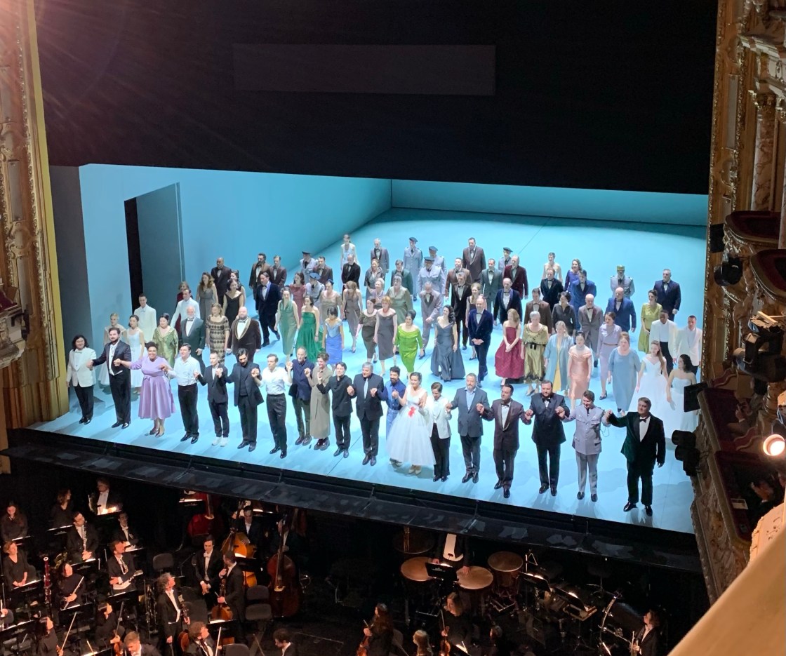 Die Inszenierung des amerikanischen Regisseurs TED HUFFMAN mit seiner Klarheit und der reduzierten Ästhetik des grossartigen Bühnenbildes von ANDREW LIEBERMANN ist umwerfend, die teils starken Bilder bleiben haften, dies war auch schon bei seiner letzten Zürcher Arbeit „Madama Butterfly“ der Fall. Losgelöst von Zeit und Ort nimmt das Drama in einem pastellfarbenen leeren Raum seinen Lauf – ein Warteraum der Geschichte, bis jeder der Protagonisten seinen Auftritt hat. Nur Stühle dienen der Orientierung und Abgrenzung zwischen den Capulets und Montagues. Von der ersten Minute an wird es für Romeo und Julia immer enger und zwar nicht nur buchstäblich, sondern auch auf der Spielfläche, die Rückwand verschiebt sich bis zur Rampe, an der sie zuletzt gemeinsam sterben. Das ist ein einfaches, beeindruckendes und sehr starkes Konzept. Die Bildwirkung ist immens. Auch mit dem Chor arbeitet Huffmann grossartig, schon lange nicht mehr so toll arrangierte Chorszenen gesehen. Die Tänzer:innen hingegen waren ganz nettes Füllmaterial, die Ballszene ein Debütantinnenball, steif und formell in seinen Konventionen, denen Romeo und Julia entfliehen wollen. Grossartig die ersten Begegnungen der beiden Liebenden, Julias erste grosse Arie – der Walzer „Je veux vivre“ – und das Finale des 3. Aktes vor der Pause (szenisch fulminant ist diese Messerstecherei der verfeindeten Familien und aus dem Graben tönt es ebenso!). BENJAMIN BERNHEIM ist ein grossartiger Romeo, nicht wirklich ungestüm, eher vernunftbetont, die Partie liegt ihm und sein strahlender Tenor klingt wunderbar in jeder Arie, in jedem Duett, selbst nach knapp 3 Stunden klingt er immer noch herrlich und höhensicher. JULIE FUCHS ist – wie immer – darstellerisch eine Wucht, man kann sich ihr nicht entziehen, auch wenn sie, wohl der Premierennervosität (Rollendebüt) geschuldet, die Partie vor allem zu Beginn manchmal etwas unsauber gestaltet, hier liegt noch viel mehr drin. Aus welchen Gründen auch immer, sind beide zusammen für mich keine super ideale Kombination am Premierenabend, für mich springt der Funke nicht über, es gibt keinen „magic moment“, aber – und das muss man dazu erwähnen – das liegt natürlich auch immer an der jeweiligen Befindlichkeit des Zuschauers. Wie schön, endlich mal wieder die grossartige KATIA LEDOUX (als Gertrude, Julias Amme) in Zürich zu sehen, auch wenn die Rolle im Grunde nicht so viel her gibt – sie macht etwas daraus (herrlich, wie sie da einfach sitzt und im Handspiegel ihre Pickel betrachtet!), sie ist eine imposante Erscheinung in ihrem fliederfarbenen Kostüm, inmitten der eher langweiligen Veroneser Gesellschaft – kein Wunder hat sie Verständnis für ihren Schützling Julia. Wie immer liefert BRENT MICHAEL SMITH (als sehr weltlicher und attraktiver Frère Laurent) eine absolut fundierte Leistung mit seinem wohlklingenden Bass. Und stimmlich und darstellerisch eine Augen- und Ohrenweide ist der Stéphano von SVETLINA STOYANOVA mit den Couplets – brava! Der Chor klingt erstaunlich präzise (Einstudierung: ERNST RAFFELSBERGER) und ist – dank der super Regiearbeit – präsent und nicht aufdringlich (wie so häufig). Bis in die kleinsten Rollen ist der Cast hervorragend besetzt, um noch die starken Sänger DAVID SOAR (Le Comte Capulet), YURIY HADZETSKYY (Mercutio), OMER KOBILJAK (Tybalt) zu nennen. Am Pult der PHILHARMONIA ZÜRICH steht bei dieser Aufführungsserie ROBERTO FORÉS VESES, der allzu grossen Gounod-Kitsch vermeidet und ein Freund zügiger Tempi ist (Danke!). Die Musik von Gounod hat ein paar schöne Duette und Szenen, insgesamt ist es schon schwülstig und stellenweise schmalzig triefend, der „Faust“ ist mir lieber, mein Lieblingskomponist wird Gounod nie werden. Durch die diversen Verzögerungen aufgrund ARTE-Anmoderationen etc. hat die Vorstellung dann auch länger als erwartet gedauert, es gab einige freie Plätze, selbst im Parkett. Ungewöhnlich für Zürich, aber eventuell dem Osterwochenende geschuldet. Eine starke Produktion, starker Applaus für die komplette Besetzung und das Regieteam. Bravi!