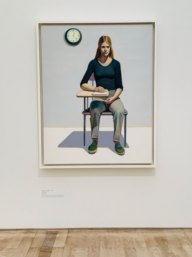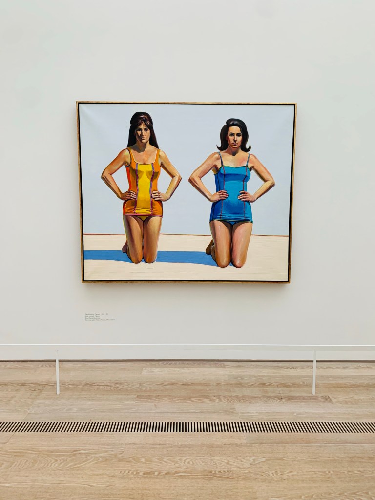 Es gibt drei grosse Themenkreise, denen sich dieser aussergewöhnliche Künstler zeitlebens gewidmet hat: Dinge, Menschen, Landschaften. Und es lohnt sich sehr zu verweilen und genauer hinzusehen. Die Motive seiner Pop-Art sind prägnant und absolute Hingucker, bekannt ist er für seine Kuchenauslagen und Tortenmotive, zu sehen gibt es aber auch Spielautomaten, Farbdosen, Alltagsgegenstände, das alles in unzähligen Farbschattierungen, die man jedoch erst beim genaueren Betrachten erfasst. Und dieses Farbspektrum ist immens. Zu sehen sind neben der grossformatigen Öl- und Acrylmalerei auch einige Zeichnungen und auch hier lohnt es sich genauer hinzusehen. Seine porträtierten Menschen faszinieren sehr, wie etwa die beiden knienden Frauenfiguren in den Badeanzügen „Two kneeling Figures“ von 1966 oder „Student“ von 1968, sehr speziell auch „Woman in Tub“ (1965), diese klaren Linien und dann nur dieser ruhende Frauenkopf, der über den Wannenrand zu sehen ist, was für eine schöne Bildkomposition!