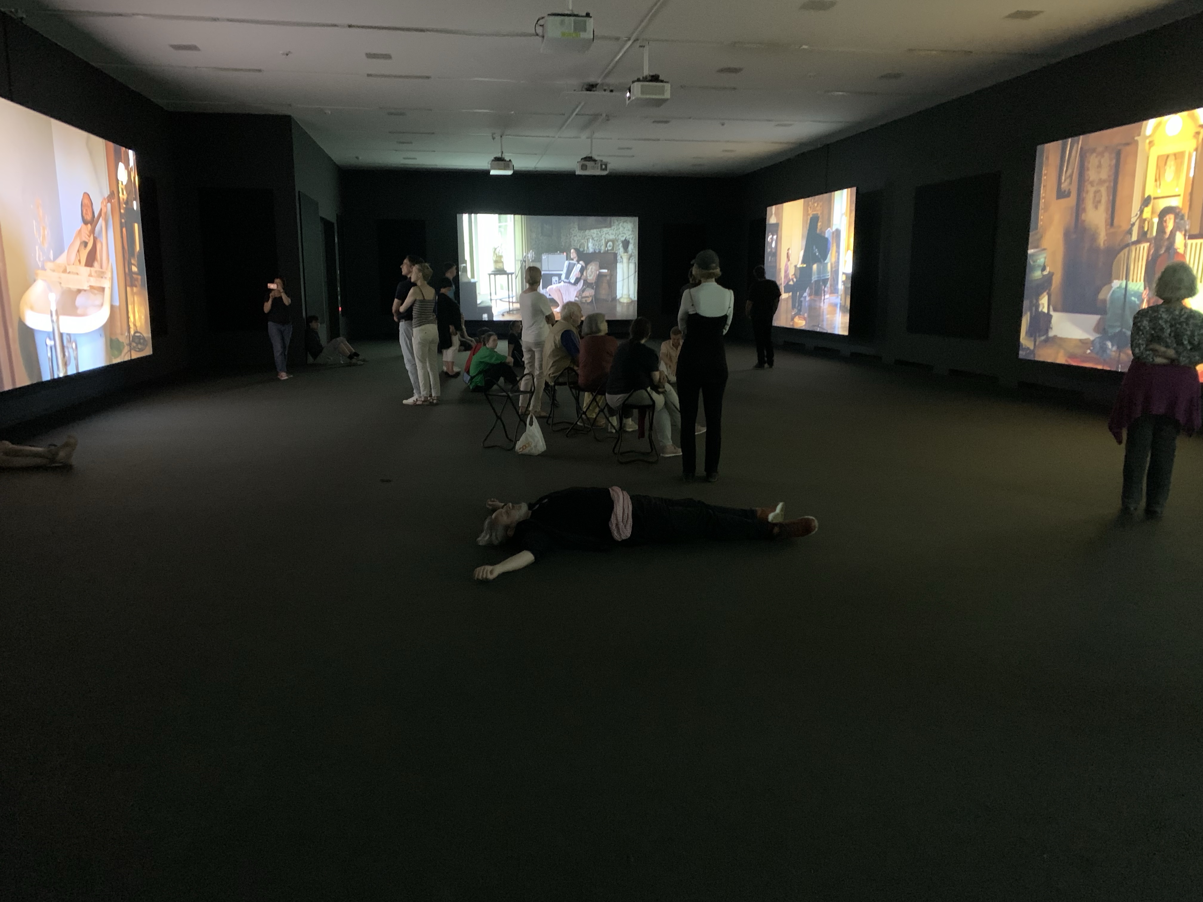 In einem Interview im „The Guardian“ antwortet Kjartansson auf die Frage, ob „The Visitors“ sein Lieblingswerk ist: „It has a special place in my heart, but it was such a feelgood piece that I had to make some really dark shit afterwards“. Das kann man sich gut vorstellen, denn verweilt man die 64 Minuten dauernde Videoarbeit im Saal, ist man absolut gechilled im Anschluss und spürt immer noch die Vibes dieser absoluten Feelgood-Music, einem Gospelkonzert mit vielen Stimmen ähnlichen Happening auf 9 Leinwänden, voll von Emotionen, voller Melancholie, Traurigkeit und einem überbordenden Mass an Freundschaft und Familienglück. Den Ohrwurm „Once again I fall into my feminine ways“ hat man noch Stunden später im Ohr. Diese Videoarbeit trägt – und das sagt er auch – die Melancholie des letzten Abba-Albums „The Visitors“ in sich.