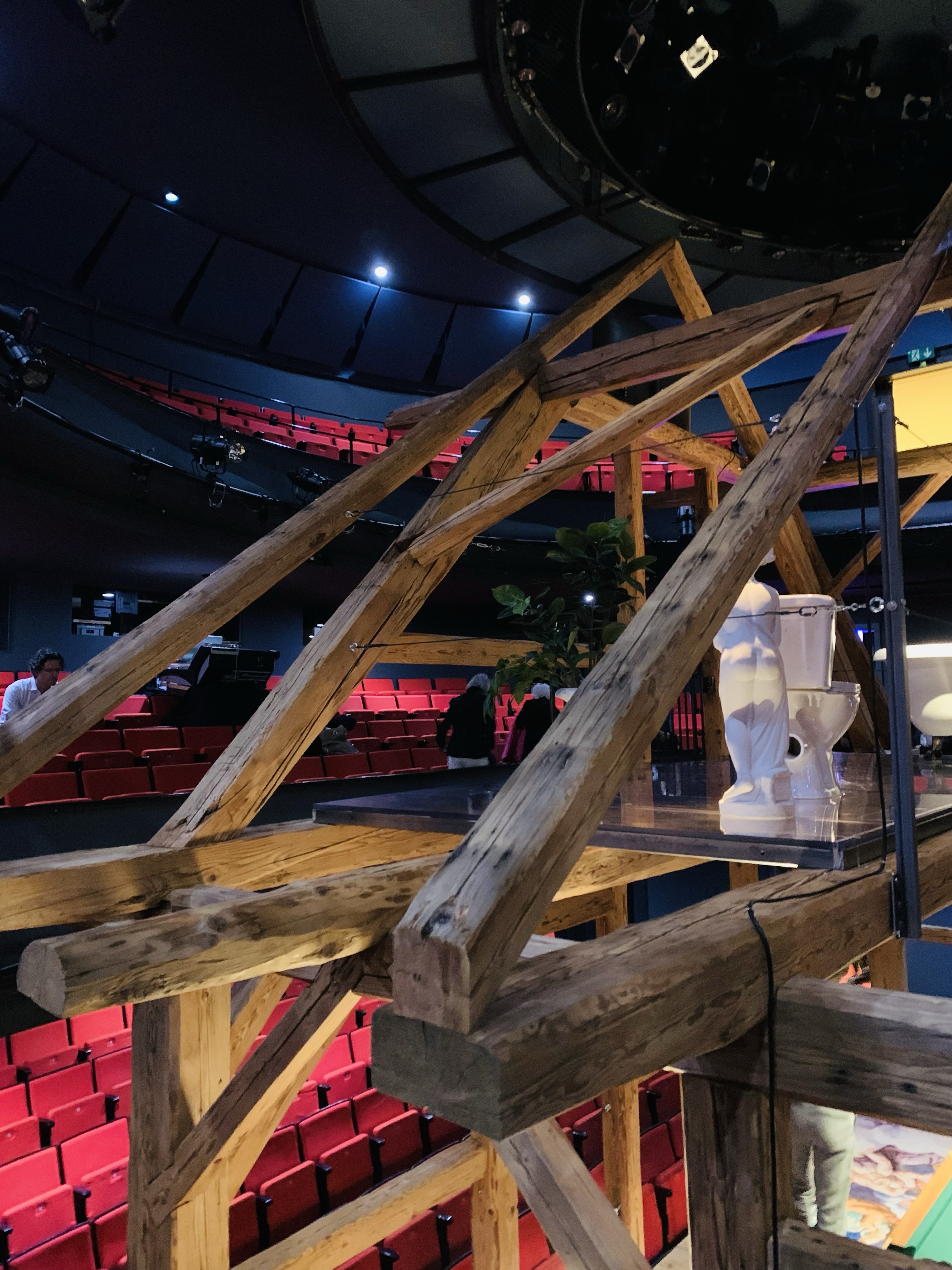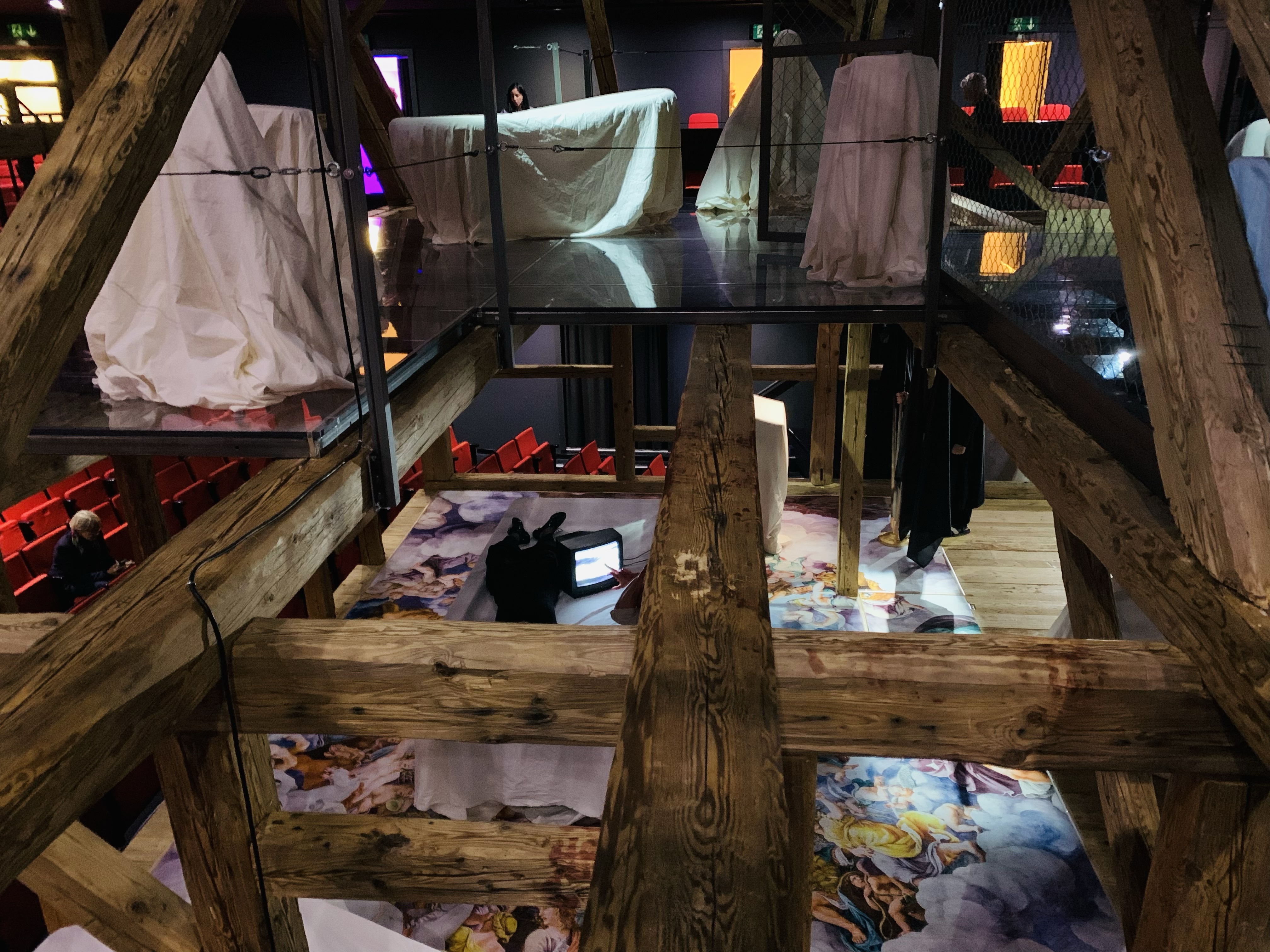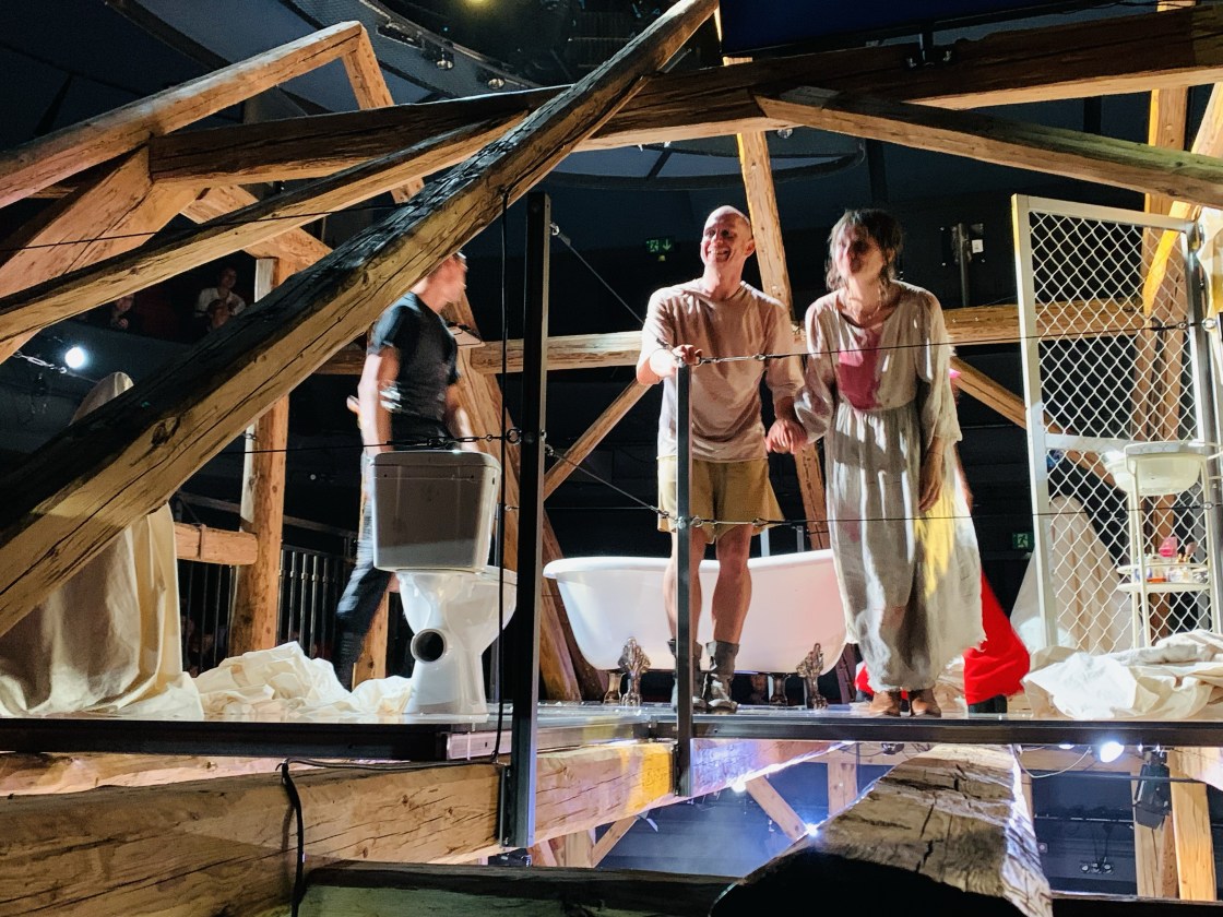 Das kleine altehrwürdige Luzerner Haus erlebt eine sehr spezielle Installation, die für die drei Eröffnungsproduktionen „Elektra“, „Orestes“ und „Dido und Aeneas“ als Spielfläche dient: DAS HAUS. Hierfür hat Ausstatter VALENTIN KÖHLER eine alte Scheune, vielmehr eine alte Innerschweizer Mosterei, aus dem Umland abgebaut und im Theaterinnenraum aufbauen lassen. Der komplette Bühnenraum, der Orchestergraben und die ersten Parkettreihen sind überbaut, das Fachwerk-Gebälk reicht bis in den zweiten Rang, ist komplett ausgestattet mit Wohn- und Schlafräumen und sämtliche Aktionen sind durch zusätzliche Live-Kamera und Videoscreens bis in den letzten Winkel verfolgbar. Wem das nicht reicht, der kann nach der Pause auf einen anderen Sitzplatz, in einen anderen Perspektivenwinkel wechseln. In diesem Haus der Atriden beschäftigt sich Regisseurin KATJA LANGENBACH mit der Frage, ob und wie man sich dem Zwang der auferlegten Rache entziehen und warum man sich nur schwer den vorgegebenen Ritualen aufgrund Familie und Herkunft entziehen kann. Es ist eine gelungene und sehr dichte Produktion, die Zeit vergeht im Flug und bis man sich versieht, sitzt man wieder im Zug nach Hause. Schrotts Fassung von 2021 ist erstmals auf einer Bühne zu sehen, er hat die beiden Stücke „Elektra“ und „Orestes“ zu einem grossen Familiendrama eingedampft, im Fokus stehen die beiden Geschwister (mit angedeutet inzestuöser Beziehung), die den Mord an ihrem Vater Agamemnon durch die Mutter Klytaimnestra und Aigisthos rächen. Die altbekannte (und immer wieder grossartige) Geschichte wird stringent erzählt, wie Furien berserkern die beiden durch den Abend. Der antike Chor besteht aus 2 Personen, in der von mir besuchten Vorstellung aufgrund Erkrankung nur noch aus TINI PRÜFERT, die den zweiten Part ebenfalls übernimmt und somit dankenswerterweise die Vorstellung rettet – es ist der letzte Abend, an denen beiden Teile zusammen gespielt werden, aber der Marathon (der aufgrund von 2 Pausen sich dann gar nicht so lange anfühlt!) lohnt sich, denn nur so steigt man wirklich ein in dieses dichte kammerspielartige Drama. Während Schrotts Fassung zu Beginn noch sehr antikisiert, fast ein wenig künstlich und unorganisch klingt, steigert es sich im zweiten Teil temporeich, klamaukartig und überspitzt, fast meint man in einem anderen Stück zu sitzen, verstärkt durch die grellen Close-ups Elektras und Orestes am Screen hat man das Gefühl sich in einem Marvel-Game zu befinden, Angst und Mordlust dominieren, die beiden haben (gemeinsam mit Pylades) nichts mehr zu verlieren, sobald das Volk von Argos den Tod der beiden beschlossen hat. Der gemeinsam ausgedachte Rettungs-Plan wird durchgezogen.
