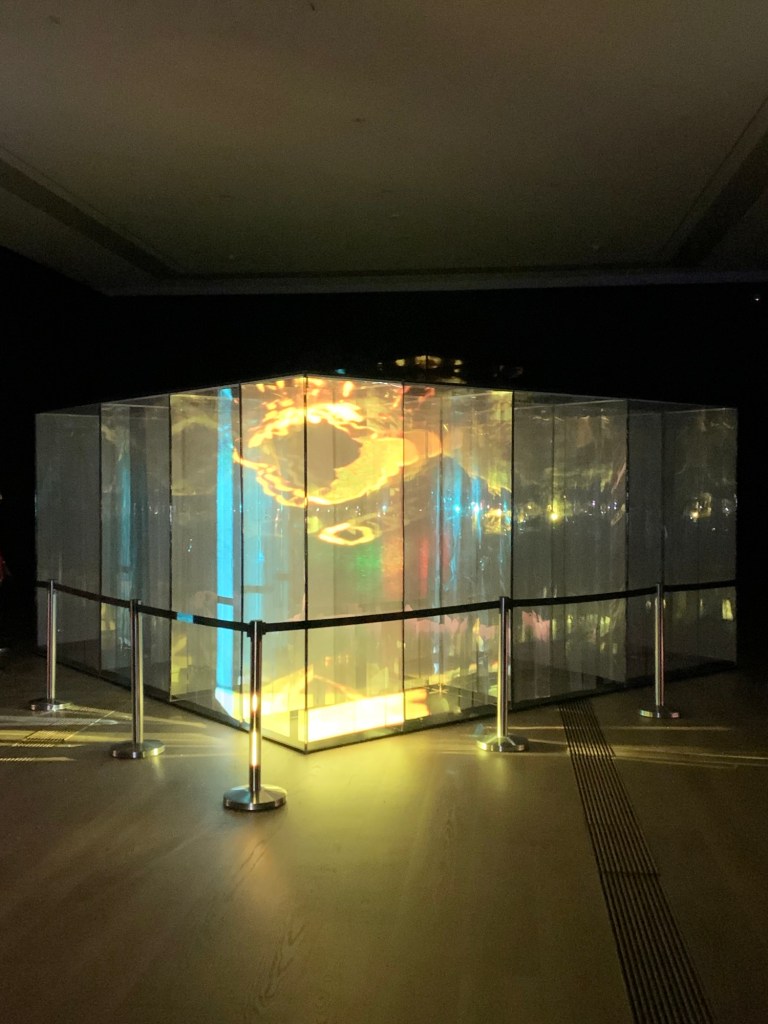 Welches der ausgestellten Werke auch immer, man fühlt sich in eine andere Welt versetzt, kann sich aktiv daran beteiligen oder sie einfach nur auf sich wirken lassen. Wunderbar etwa das immersive Filmerlebnis „Film Ambiente“ (Marinella Pirelli), schön von aussen mit seinen wechselnden Projektionen, aber auch interessant, den Kubus mit seinen transparenten Paneelen zu betreten. All diese immersiven Werke schaffen ungewöhnliche Räume, die eine Schärfung und manchmal auch Desorientierung der Sinne bewirken. Und neben der unglaublichen Schönheit einiger Werke, macht der Ausstellungsbesuch grossen Spass.