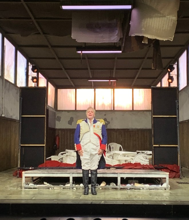 Es ist 34 Jahre her, seit ich diesen wunderbaren Text zum ersten mal auf einer Bühne gesehen habe (damals am Schauspielhaus Nürnberg in der Regie von Hansjörg Utzerath) und er ist gut gealtert, immer noch spielbar, aktuell, zeitgemäss und einmal mehr wird mir klar, warum Thomas Bernhard für seine Stücke in Österreich so angefeindet wurde. Bernhard zeigt ihn klar und deutlich, diesen alten und immer noch vorhandenen Mief in den Städten, aber vor allem am Land, in der Provinz, dieses ewig Gestrige, dieses Land, mit seinem all die Jahre überdauerten Faschismus. Es ist aber auch ein sehr aktuelles Stück über das noch häufig vorherrschende Machtvakuum im Theaterbetrieb, über cholerische Theatermacher, Intendanten, Impressarios, über die zwar abnehmende, aber doch noch stark vorhandene Dominanz der Männer in dieser Blase. Das wunderbare an dieser Inszenierung ist, dass eine Frau einen Mann spielt, der fortwährend über Frauen spricht und wie schädlich sie für das Theater sind. Und so denke ich mir, dass es heute gar nicht mehr möglich wäre, diese Textpassagen von einem Mann sprechen zu lassen, das wäre unerträglich und nicht auszuhalten. So aber erleben wir eine heftig polternde Stefanie Reinsperger mit österreichischem Schmäh und ganz leicht dialektischen Färbung in dieser klugen Besetzung – cholerisch, jammernd, hypertonisch und in der stickigen Schwüle des feuchten Theatersaals vor dem aufkommenden Gewitter deklamierend. Sie wettert und schimpft und flucht und bittet anschliessend auf Knien weinerlich um Verzeihung, nur um im nächsten Satz wieder auf die grossen Defizite sämtlicher Personen hinzuweisen. Denn niemand ist ihm gleich, kann es ihm recht machen – dem grossen Staatsschauspieler Bruscon, der sich in diesem miesen Provinzdorf Utzbach – es kommt ihm kaum über die Lippen – auf dieser Tournee wiederfindet, wo es nach Schweinekoben riecht und der Theatersaal eher einer grossen Abstellkammer gleicht, wo sich neben allerlei Gerümpel eben auch noch ein Hitler-Porträt finden lässt.