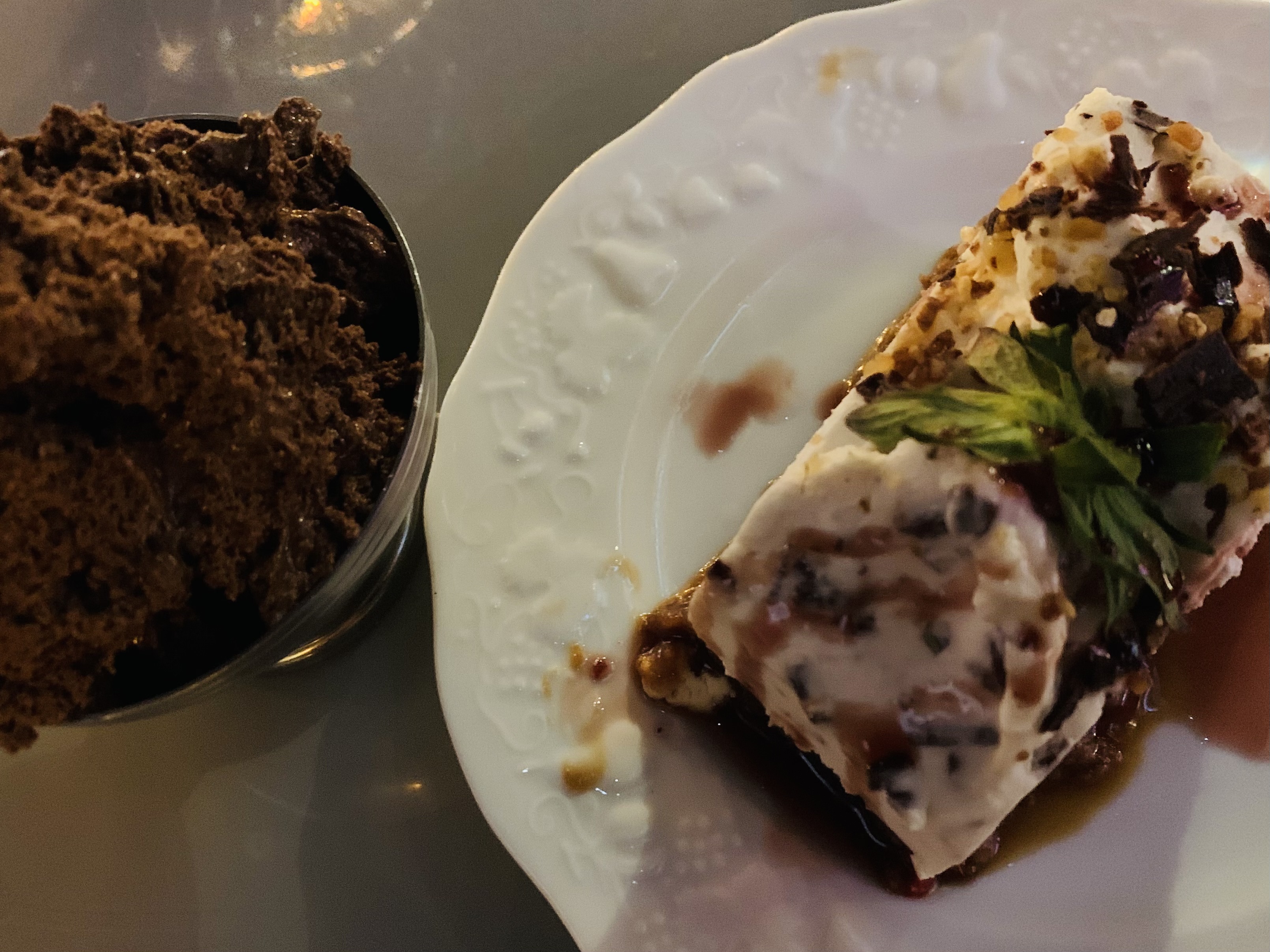 salade de lentilles / tartare de poisson / saucisse à l‘ail des ours / les œufs „mémère“ / mousse au chocolat / le….fe.