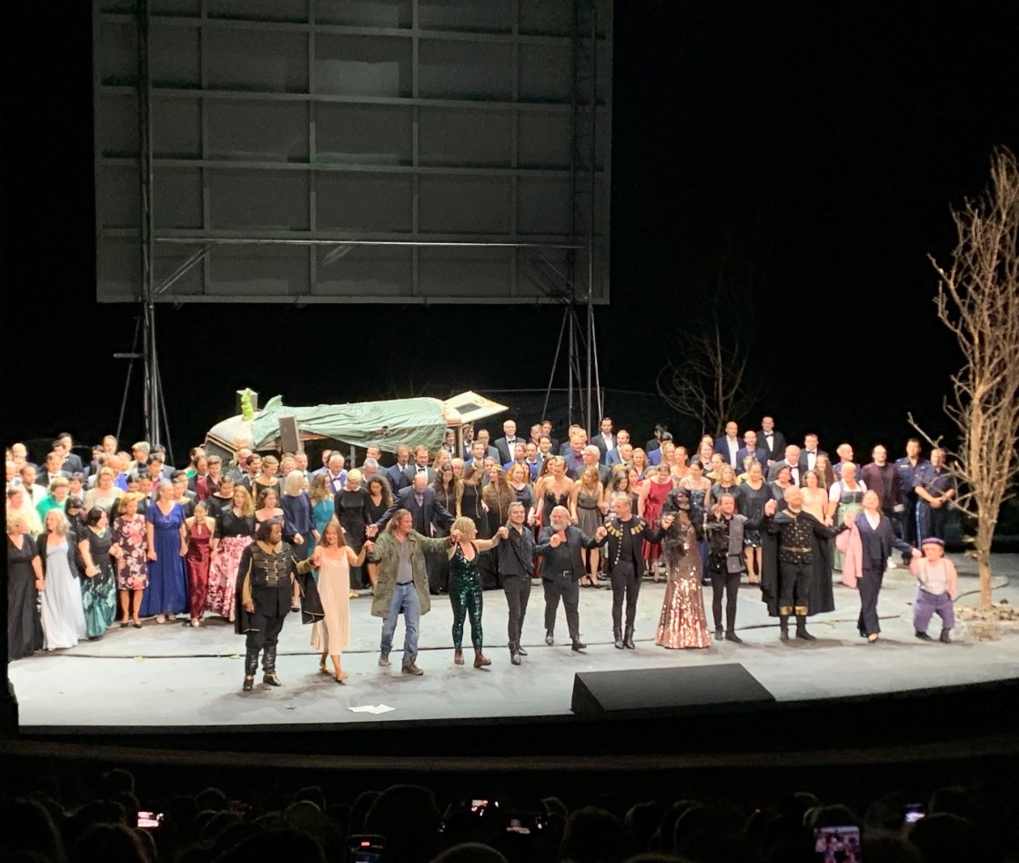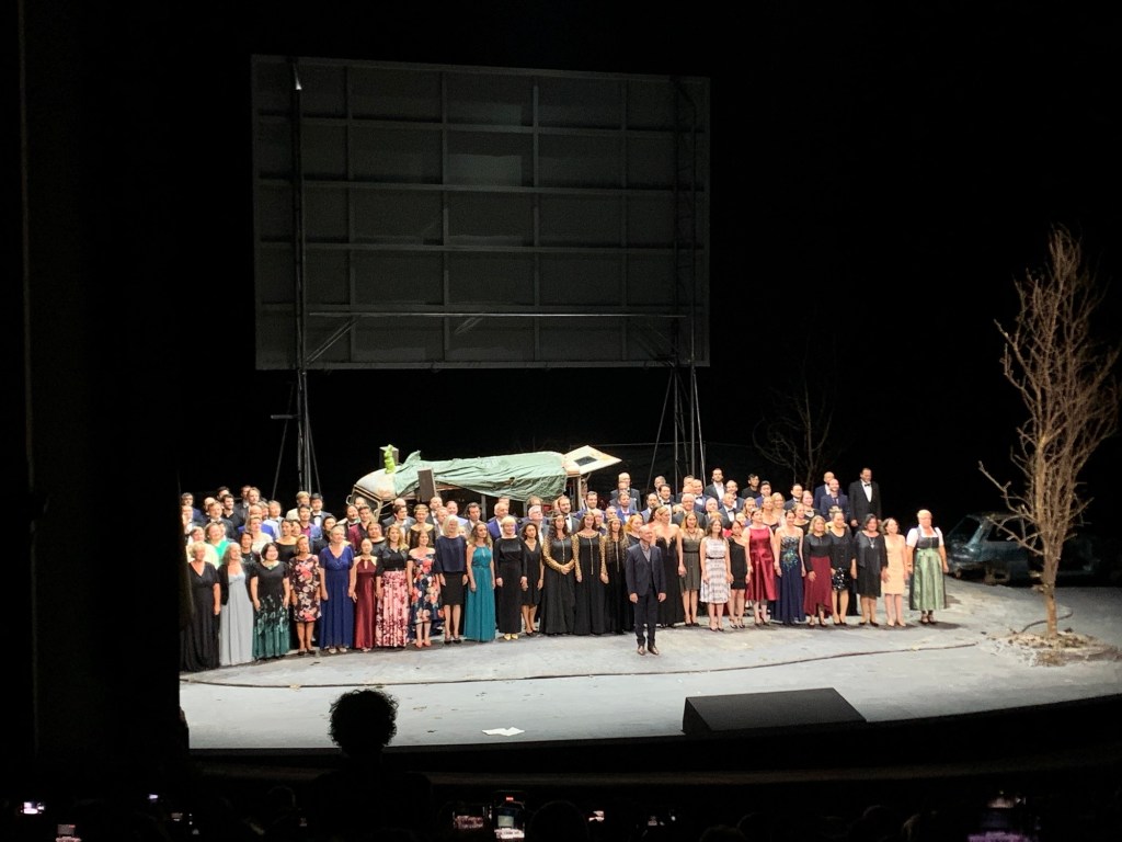 Wie bei allen Werken Wagners hat auch der „Tannhäuser“ ein paar Längen, nicht so in Kratzers Umsetzung, hier passt einfach alles, diese 5 Stunden sind unterhaltsam von Anbeginn bis hin zu den letzten Momenten, wenn dieses grosse und bunte Chorfest zu Ende wabert, denn einmal mehr hat der nun scheidende Chordirektor EBERHARD FRIEDRICH grossartiges geleistet, dafür ist Bayreuth bekannt und nach so vielen Jahren verlässt er nun den Hügel, dafür wird er beim Applaus auch ausgiebig gefeiert – Bravo! In diesem „Tannhäuser“ vereint Kratzer alles, was eine gelungene Inszenierung braucht – sie hat Witz, ist politisch, bewegt und rührt zu Tränen, bietet ausgereifte Charaktere und Personenregie, erzählt den Plot, hat interessante Twists und dermassen famose Regie-Einfälle, dass man nur so staunt. Was für ein grossartiger Festival-Abschluss, wenn das Publikum fast einhellig hingerissen ist von dieser Umsetzung und unglaublich tollen Besetzung. Bewegend bereits zu Beginn im grossartigen und immer wieder aktualisierten Video von MANUEL BRAUN die Hommage an den verstorbenen Stephen Gould – das erlebt man in Bayreuth selten bis nie, dass es während der Vorstellung Applaus gibt. Zu sehr ist man hier immer noch alten Konventionen verhaftet. Und nach der wirklich furchtbaren und nichtssagenden letzten Tannhäuser-Inszenierung in Bayreuth von Sebastian Baumgarten (dessen Arbeit ich sonst wirklich sehr schätze!) versöhnt mich das nun mit diesem Werk. Ich kann es nur nochmals betonen – dieser „Tannhäuser“ ist eines meiner Bayreuth-Highlights der letzten 32 Jahre! Bereits während der Ouvertüre, wenn im Video Venus mit ihrer schrägen Varieté-Truppe (Tannhäuser als trauriger Clown und dazu der wunderbare LE GATEAU CHOCOLAT mit dem ebenso in jedem Moment äusserst berührenden MANNI LAUDENBACH) durch die fränkischen Wälder und Landschaften fährt, bei McDonalds einkauft, bis man dann am grünen Hügel landet, ist man schockverliebt in diese Bildwelt, in dieses Szenario, in diese fabelhaft erzählte Geschichte. Und es hat so viele grossartige Momente, etwa wenn Venus mit ihren beiden Komplizen ins Festspielhaus über den Balkon einsteigt, Festspiel-Chefin Katharina Wagner die 110 wählt und sehr amerikanisch eine Kolonne an bayerischen Polizeiwagen im Grosseinsatz das Festspielhaus stürmt oder Venus dann im 2. Aufzug im Saal der Wartburg am Sängerfest teilnimmt und alles etwas aufmischt, dazu die vielen Backstage-Momente, die über den Videoscreen zu sehen sind. Es geht um Revolution und Religion, um den Gegensatz von E-Musik (grosse Kunst = Oper) und Tingeltangel und der Tatsache, dass eben nicht immer alles schwarz und weiss, sondern das Leben facettenreich und bunt ist. Grossartig auch die Pausenshow nach dem 1. Aufzug, wo LE GATEAU CHOCOLAT den Weiher im Festspielpark bespielt und Songs zum besten gibt, das Repertoire reicht dabei von „Old man River“ (aus „Showboat“), über die Spicegirls, bis hin zu „Part of your world“ aus Disneys „Little Mermaid“ und natürlich der „Hallenarie“ aus dem „Tannhäuser“, mit der es dann nach der Pause weitergeht. LE GATEAU CHOCOLAT ist eine omnipräsente Wucht und sensationelle Bereicherung für dieses Ensemble. EKATERINA GUBANOVA in ihrem Pailletten-Catsuit ist eine grossartige Venus mit wunderbarer Stimme und herrlich spielfreudig bis in den Schlussapplaus. Absoluter Gegenpol dazu ist die eher in sich gekehrt liebende Elisabeth von ELISABETH TEIGE, sehr bewegend, mit wunderschöner Stimme, ein klein wenig stört mich (jedoch nur zu Beginn) ihr Tremolo, aber das ist Geschmacksache. Auch sie eine grossartige Darstellerin! Der Tannhäuser von KLAUS FLORIAN VOGT ist unglaublich feinfühlig und wunderbar in den lyrischen Momenten, so habe ich Vogt noch nie erlebt, voller Sensibilität und Gespür für diese Inszenierung, für diesen, ach so traurigen Clown. Man kann es fast nicht glauben, wenn er am Schluss mit Elisabeth gemeinsam in den Sonnenuntergang fährt. Ist das ein Traum oder Wirklichkeit? Man weiss es nicht, denn ich bin mir nicht sicher, ob diese tieftraurige und einsame Elisabeth, die sich ritzt und selbst verletzt, diese Tragödie ihres Lebens tatsächlich überlebt. Denn der dritte Aufzug hinterlässt – bis auf den inzwischen erfolgreichen Le Gateau Chocolat (mit eigener diamantbesetzter Uhren-Edition) im Grunde nur gescheiterte Existenzen. Vogts Romerzählung im 3. Aufzug ist definitiv eines der musikalischen Highlights dieser Vorstellung, neben dem derartig traurigen und bewegenden „Lied vom Abendstern“ des fulminanten MARKUS EICHE als Wolfram von Eschenbach. Besonders erwähnen muss man unbedingt FLURINA STUCKI (ein junger Hirt), OLAFUR SIGURDARSON (der mich bereits am Tag zuvor als Kurwenal im „Tristan“ sehr begeistert hat) als Biterolf und allen voran SIYABONGO MAQUNGO als Walther von der Vogelweide, was für eine Entdeckung! In den weiteren Rollen: JENS-ERIK AASBØ (Reinmar von Zweter), MARTIN KOCH (Heinrich der Schreiber) und als Edelknaben: SIMONE LERCH, LAURA MARGARET SMITH, ANNETTE GUTJAHR sowie lustigerweise EKATERINA GUBANOVA, die sich als Venus noch dazwischen schmuggelt. GÜNTHER GROISSBÖCKS Landgraf Hermann – mit seinem samtig-weichen Bariton – ist gediegen, kraftvoll und gefällt mir in dieser Inszenierung unglaublich gut, wie sonst auch immer. Ich bin versöhnt, nachdem ich am Vorabend von seinem König Marke im „Tristan“ etwas enttäuscht war. Und am Pult eine Offenbarung: NATHALIE STUTZMANN – ganz ehrlich, so toll habe ich den Tannhäuser noch nie gehört. Grosse Emotionen bei den Chören und gleichzeitig fast schon kammermusikalische Intimität. Ich bin hin und weg von diesem Dirigat. Verdienter Jubel am Schluss. Für alle.