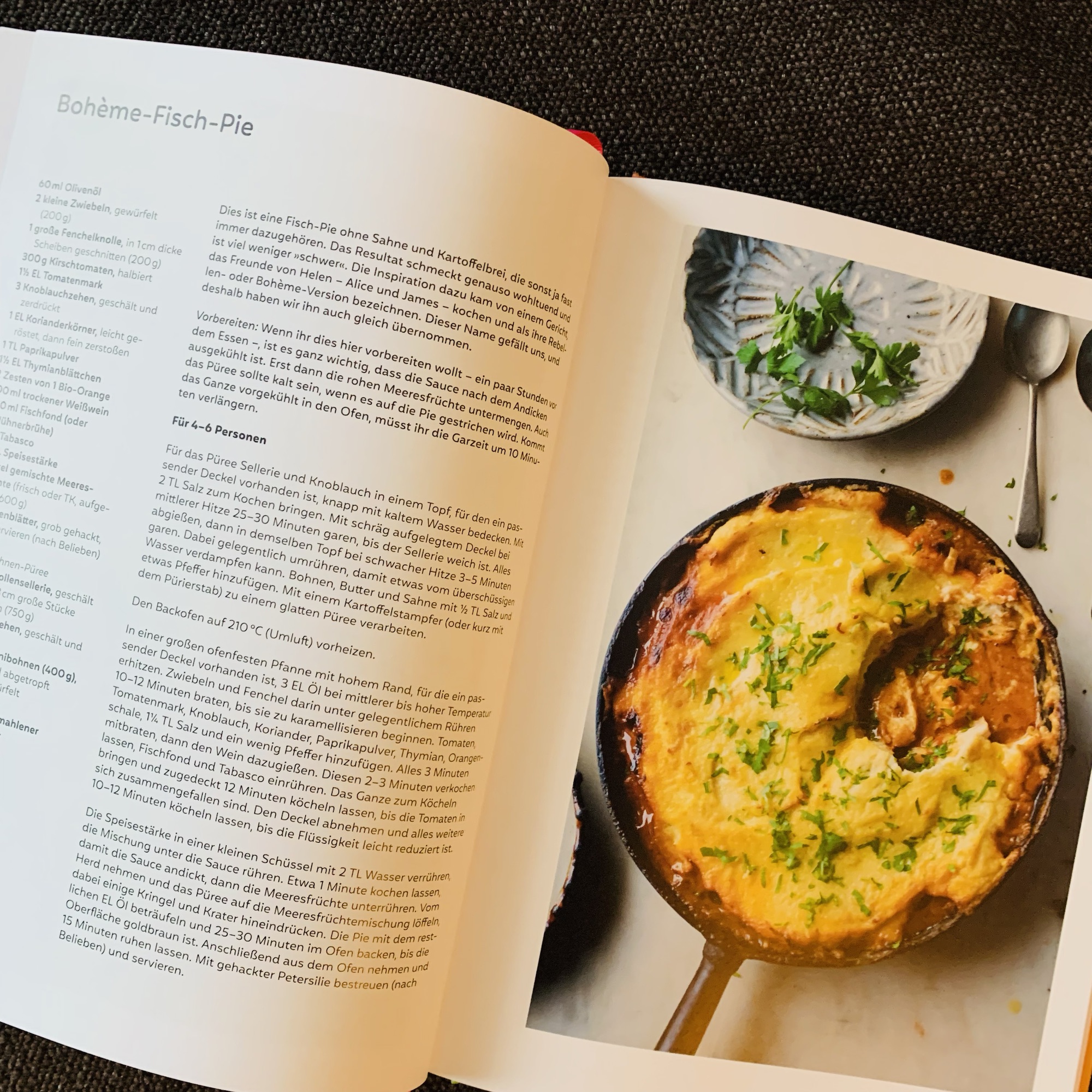 Anders als bei all den bisherigen Kochbüchern Ottolenghis habe ich bei „Comfort“ das Gefühl, dass die Gerichte weniger aufwendig sind, weniger Zutaten erfordern (aber das ist relativ!), aber auch für das erste ausprobierte und wirklich grossartige Pilz-Ragú stand man insgesamt mit Vorbereitungen und Kochzeit gute 2 h in der Küche – so what! – deswegen macht man das, das hat etwas entspannendes und belohnt wird man tatsächlich mit Comfort-Food, den man einfach nur lieben muss. Die Rezepte spiegeln Kindheitserinnerungen der Autor:innen, Reiseeindrücke, persönliche Erfahrungen wieder – wie immer modifiziert und neu interpretiert und das ist auch das grosse Geheimnis der Küche Yotam Ottolenghis und seiner Mitstreiter:innen, man fühlt sich wohl, man hat immer dieses berauschende Gefühl einer absolut neuen Geschmackserfahrung. Beim Durchblättern möchte man am liebsten sofort alles liegen und stehen lassen, auf den Markt zum Einkaufen, um sich dann Gerichten wie einem „Kartoffel-Fenchel-Auflauf mit Räucherlachs“, „Pochiertes Hähnchen mit Chinakohl und Erdnuss-Rayu“, „Reis-Vermicelli mit Kurkuma-Fisch, Dill und Frühlingszwiebel“ oder „Lachsfrikadellen mit Chermoula-Remoulade“ zu widmen. Ein Rezept klingt besser als das nächste, die einzelnen Kapitel decken eine immense Bandbreite unterschiedlicher Küchen ab: