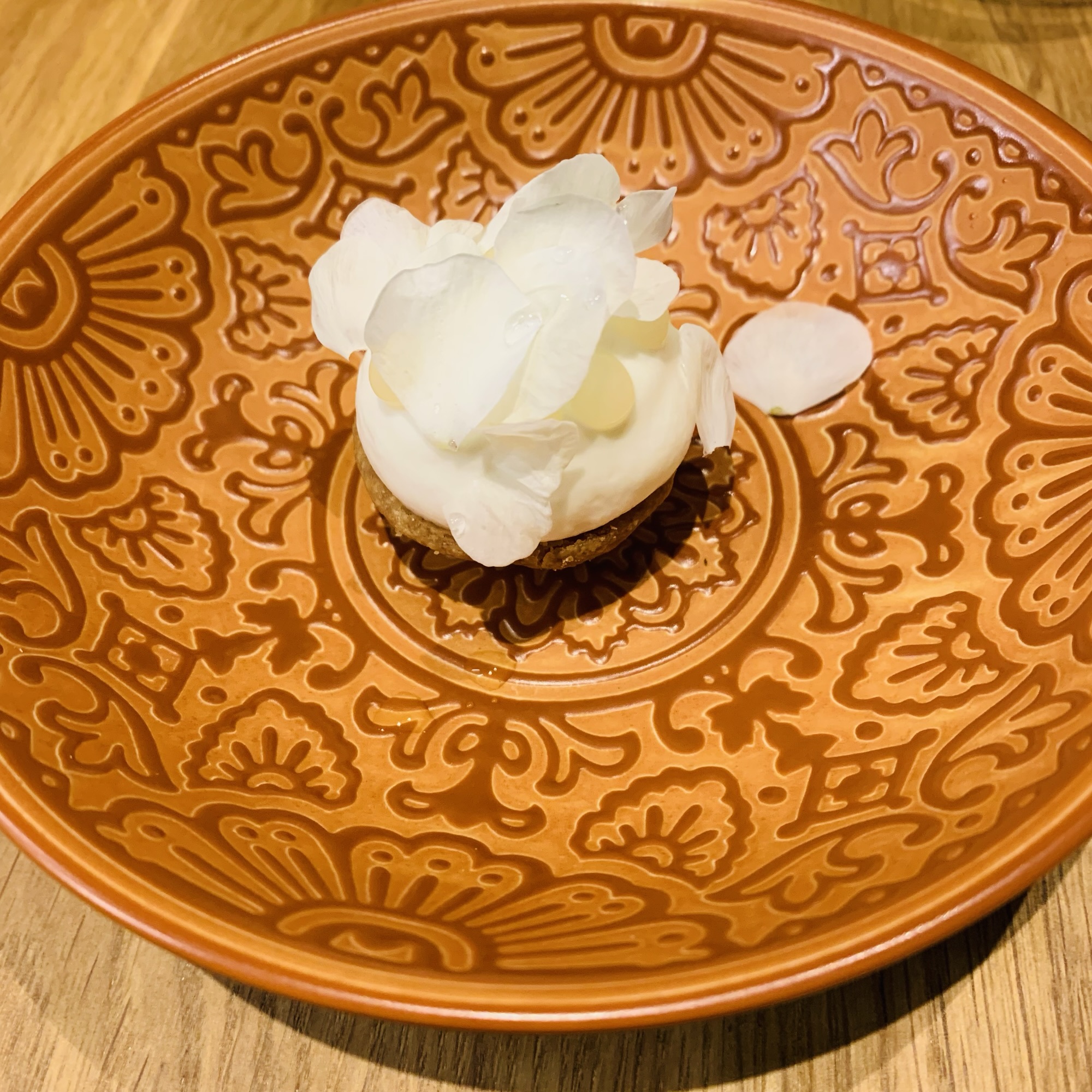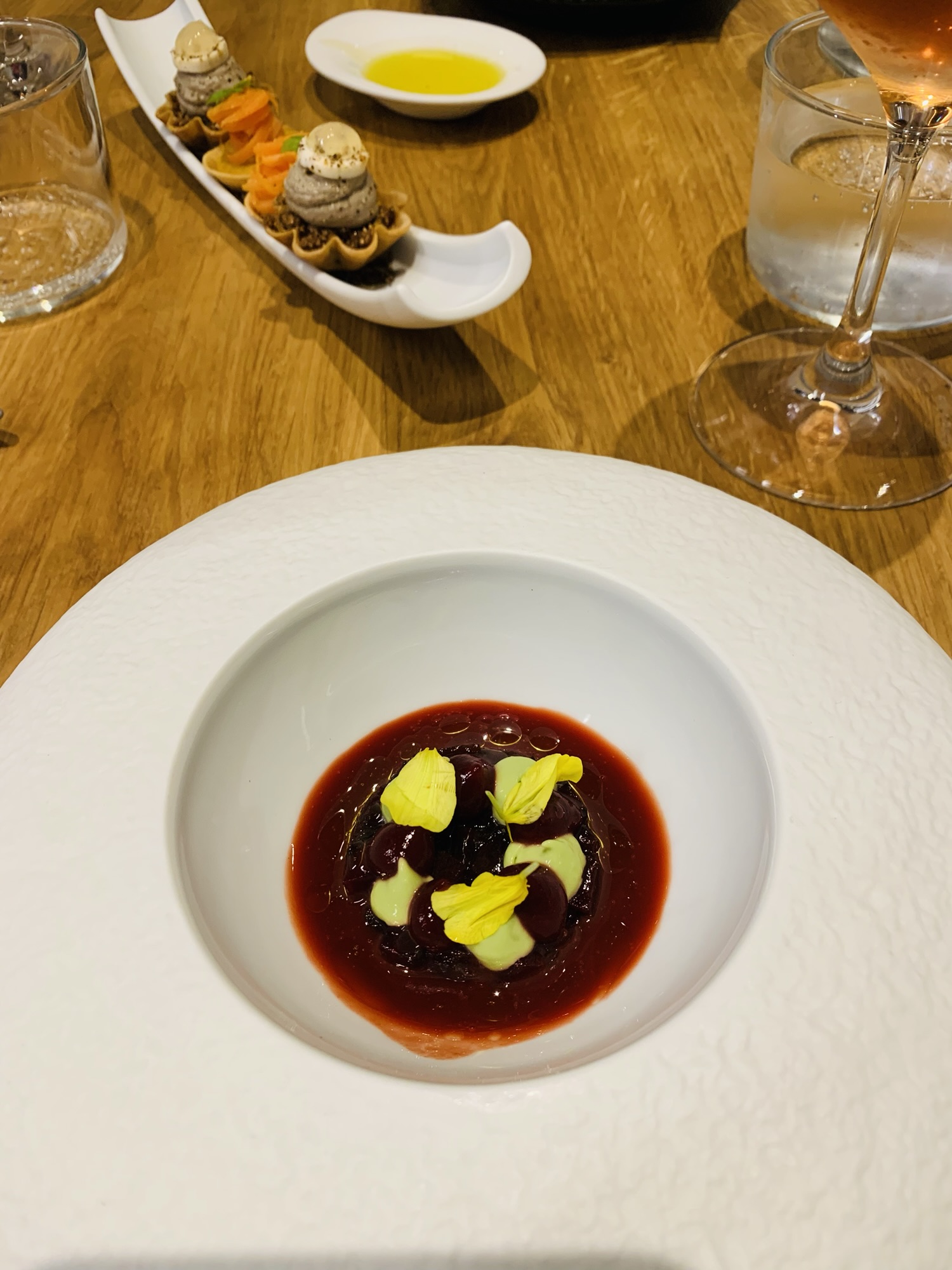 Tartelette carotte cumin/Giroles en tapenade façon bonne-maman/la betterave en tartare et consommé, oseille et baie d’andaliman – fleur de radis, rafraîchie au jasmin et relevée au poivre voatsiperifery – ravioles de canard, poireaux et bouillon phnom penh – lieu jaune de ligne confit, déclinaison de sarrasin parfumé au combava – interprétation du colvert à l’apicius en deux service – le géranium citronné en fraîcheur – baba fenouil agrumes estragon – signature dessert: le chocolat façon „after eight“ à la tagète – mignardises