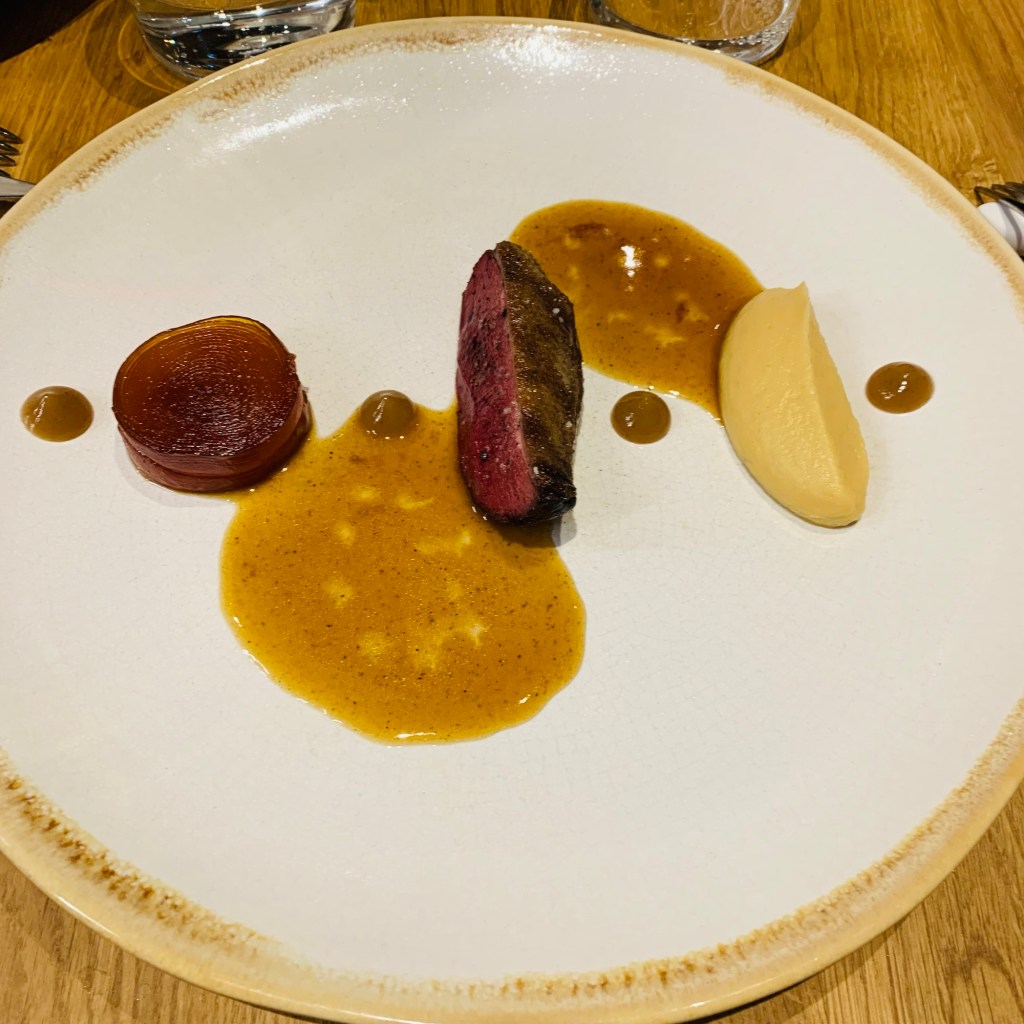 Youssef Marzouk, Sohn eines Konditors und einer Gastronomin, hat von klein auf in der Küche gestanden und mit jedem Gang, den er teilweise selbst am Tisch serviert spürt man seine Begeisterung für all die verwendeten und gar besonderen blumigen Aromen wie Tagetes, Kaffernlimette und Geranium oder ausgefallene Zutaten wie Sauerampfer und Andalibeeren. Marzouk lässt uns mit Raffinesse an seinen kulinarischen Kindheitserinnerungen teilhaben – jeder Gang ist überraschend und bietet Neues, die Weinbegleitung dazu ist exzellent.