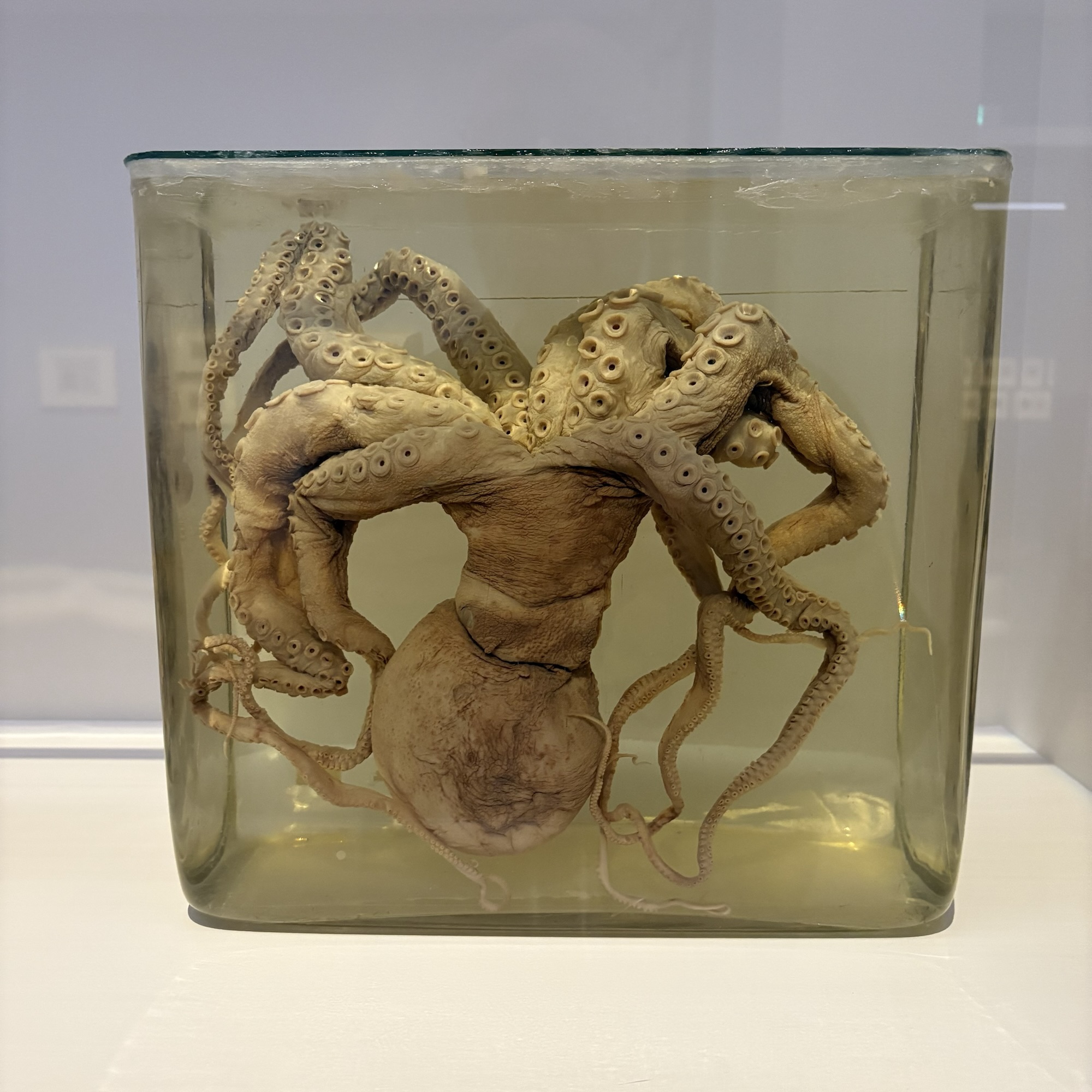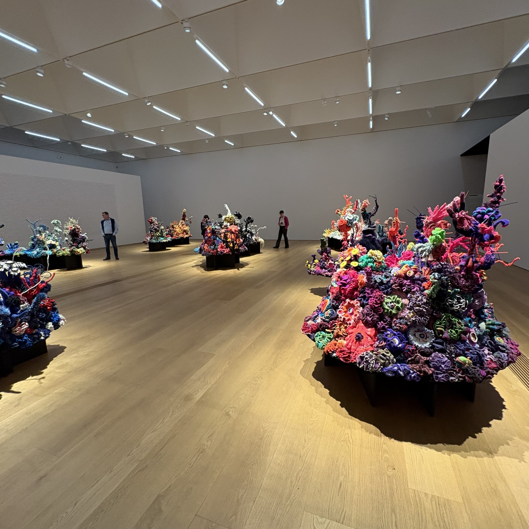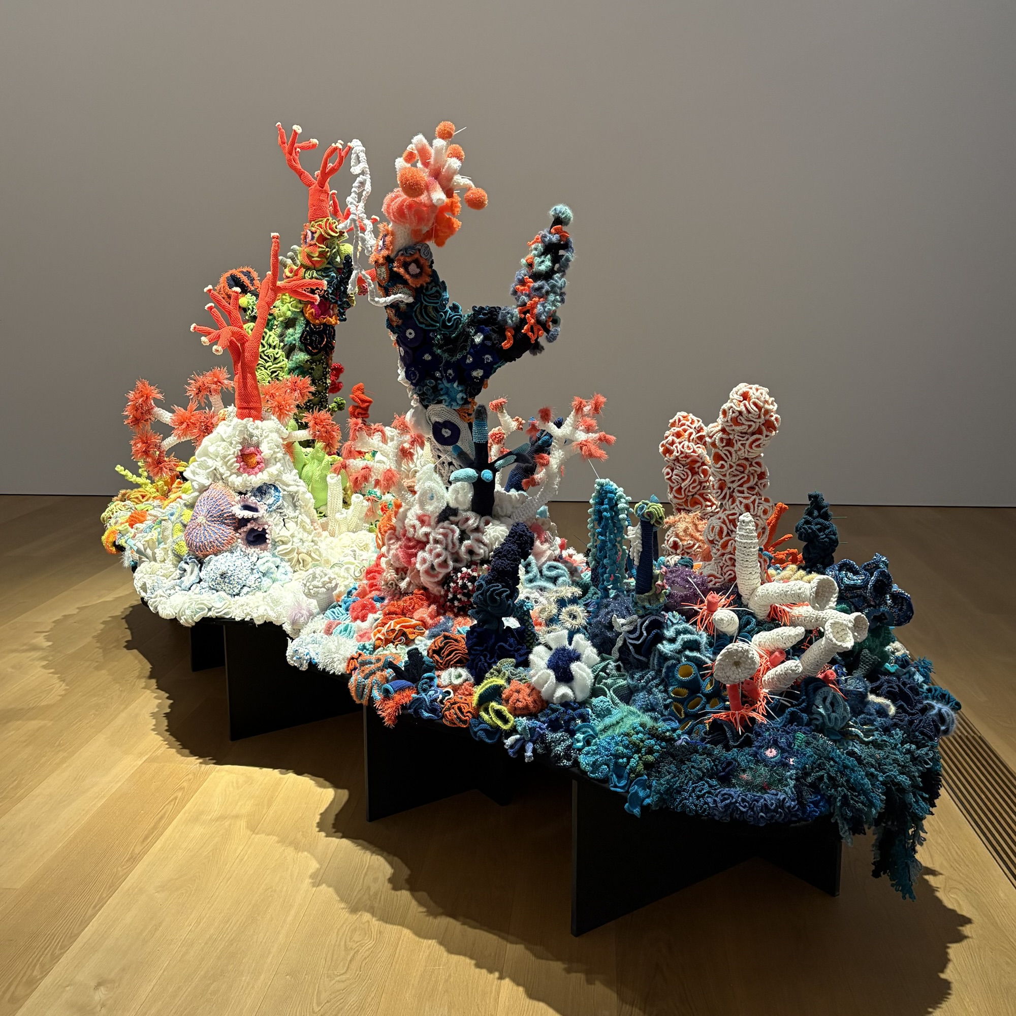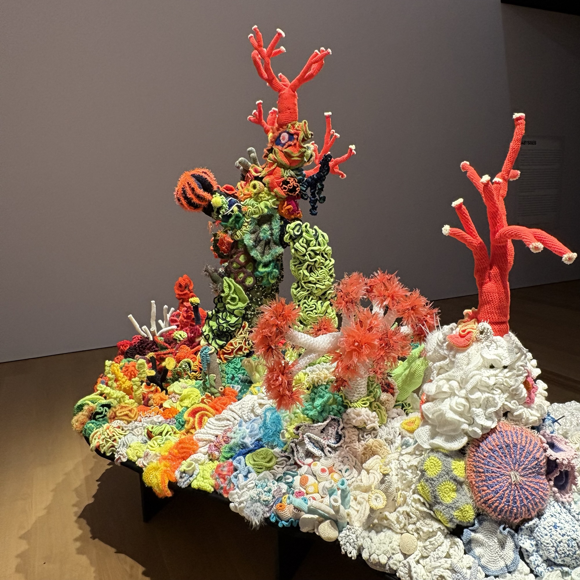 Die Ausstellung ist gut besucht, kein Wunder, denn sie untersucht unsere Beziehung zum Meer, von figurativen Werken des 19. Jahrhunderts bis heute – da ist für jeden was dabei und so begegnet man neben technischen Erfindungen wie der Taucherglocke oder dem Aquarium auch verschiedenen Gerätschaften und natürlich Gemälden und Skulpturen und im 2. Stock dem wundervollen (Forschungsprojekt-)Projekt Crochet Coral Reef, einem gehäkelten Korallenriff, von Margaret und Christine Wertheim sowie dem Institute For Figuring.